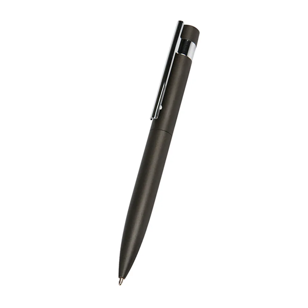 Bolígrafo de aluminio de tinta azul, con clip, punta y detalles en cromo. Mecanismo de click.