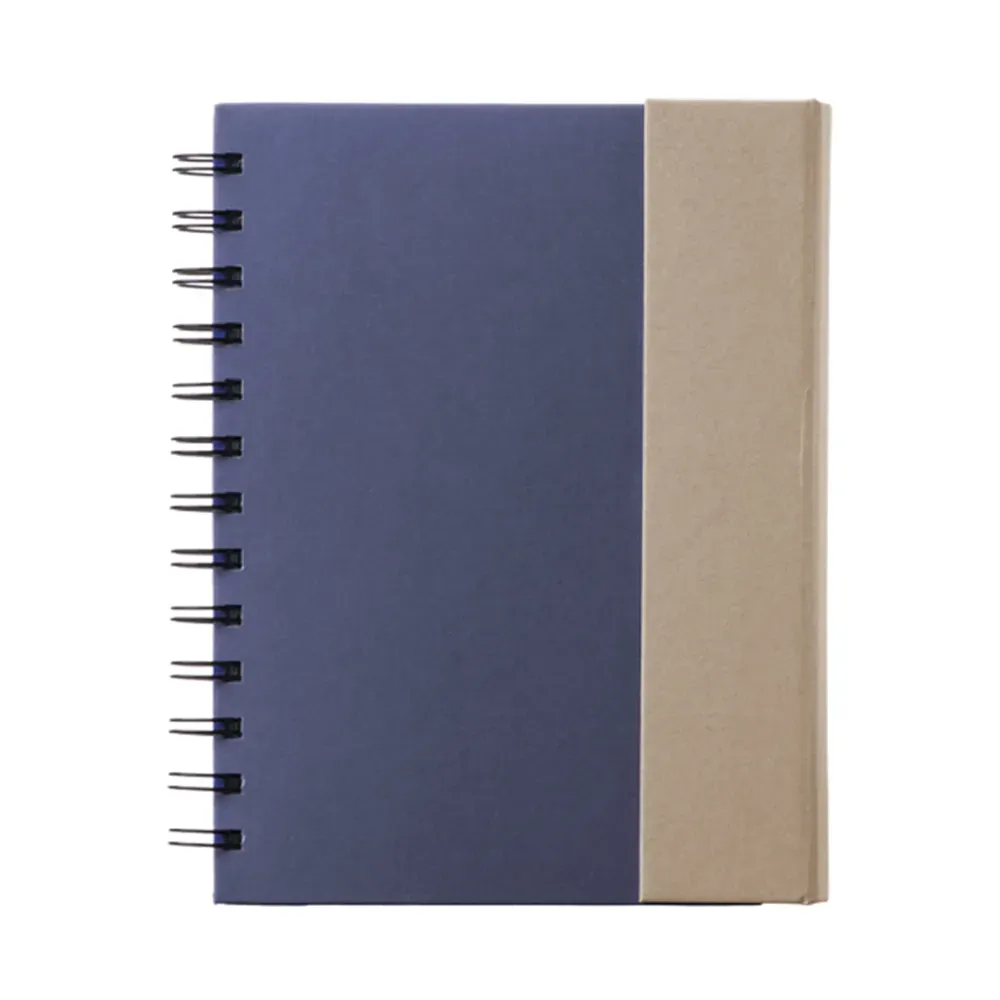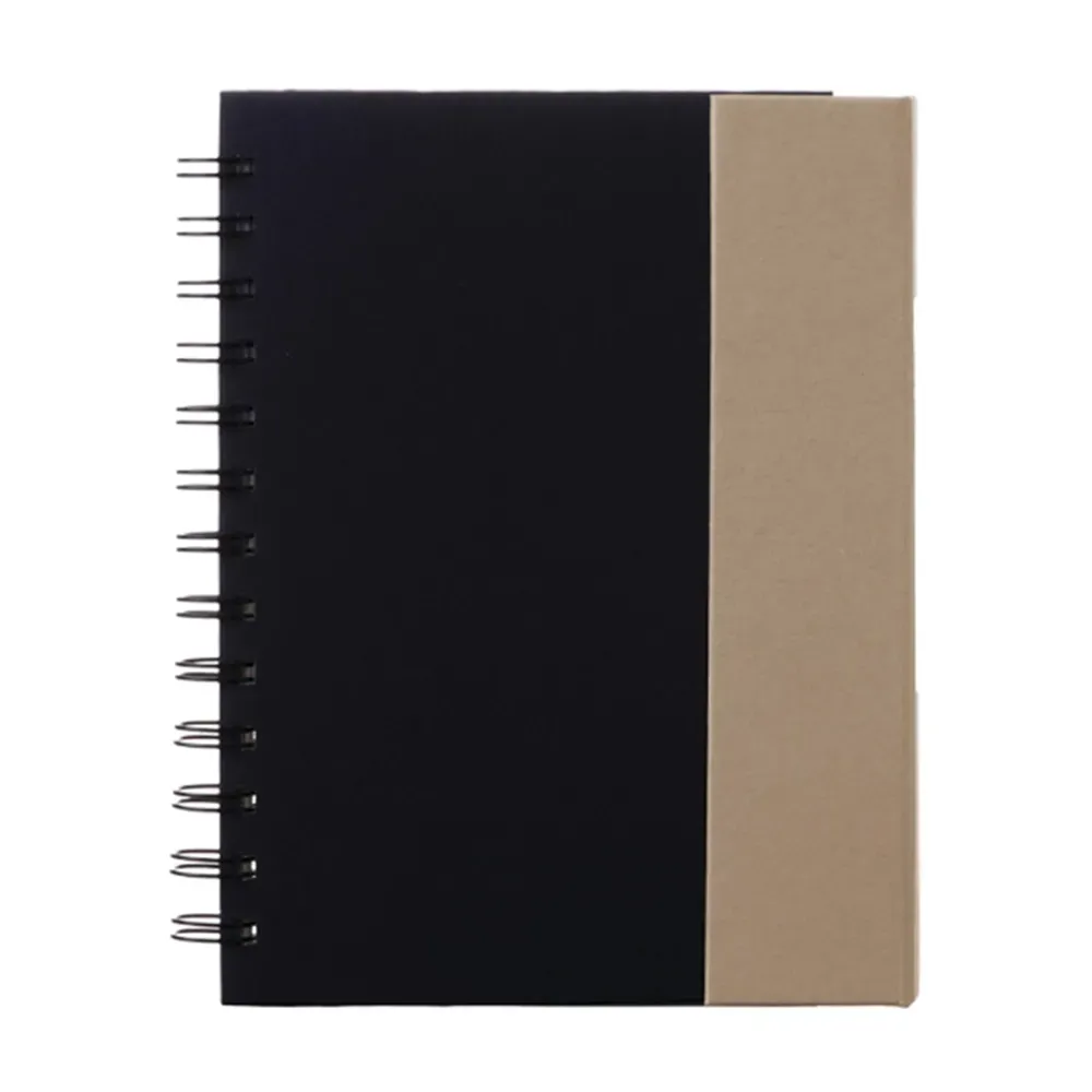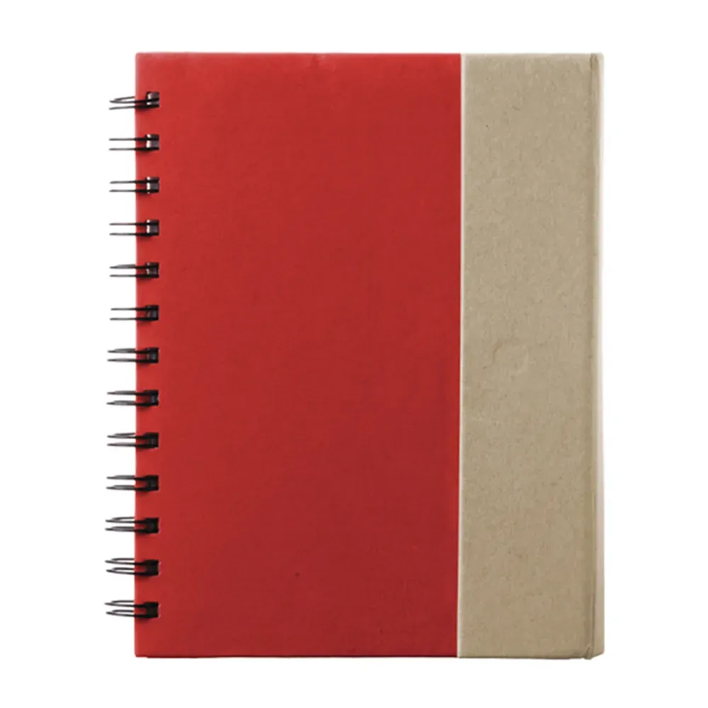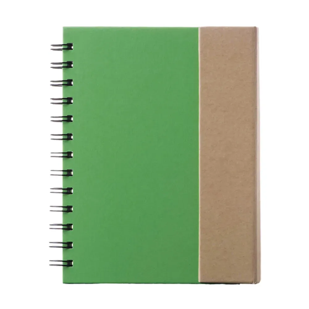 Libreta ecológica con espiral metálico, broche magnético y protector de externos. Incluye 5 bandas adhesivas en colores diferentes y blocks de notas rectangulares en 2 tamaños. 70 hojas rayadas (140 páginas) y bolígrafo de papel con sujetador elástico.