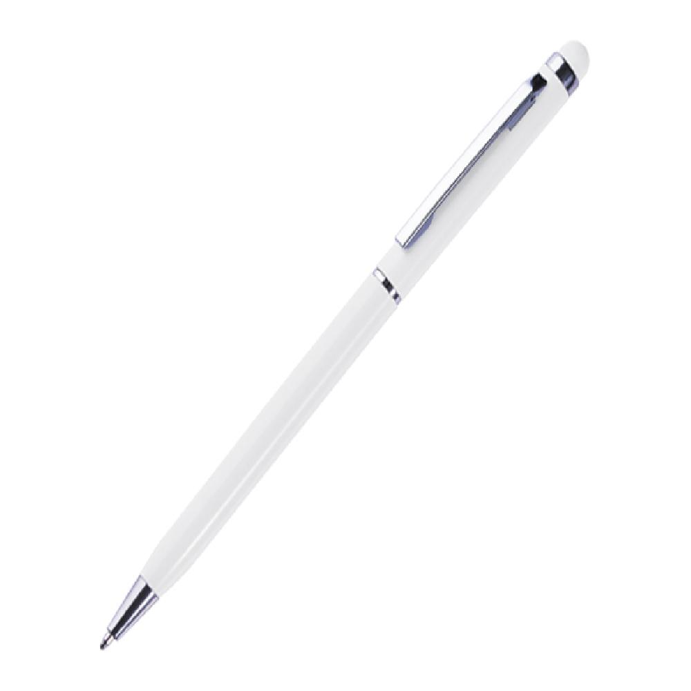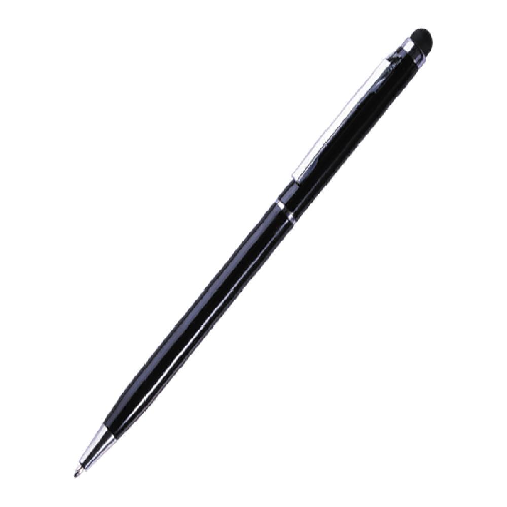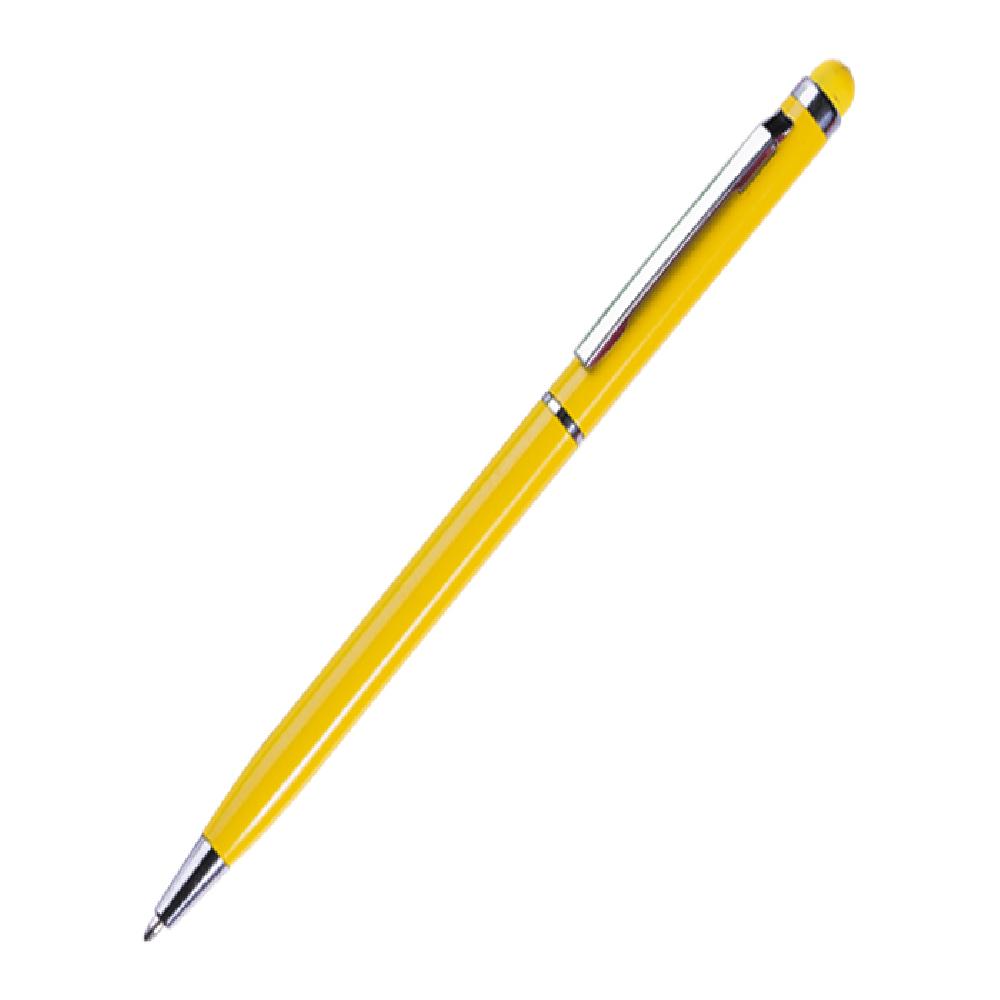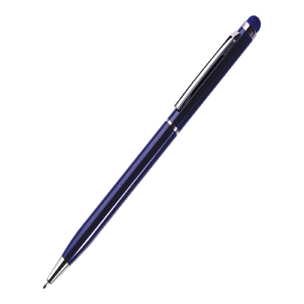 Bolígrafo metálico delgado y ligero de tinta azul, es de color sólido con acabado brillante, cuenta con clip, punta y detalles en cromo. Tiene touch del color del bolígrafo para dispositivos táctiles. Mecanismo retráctil.