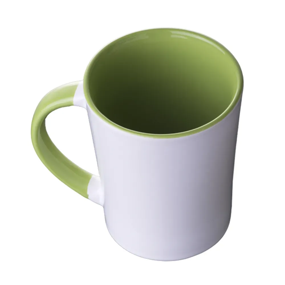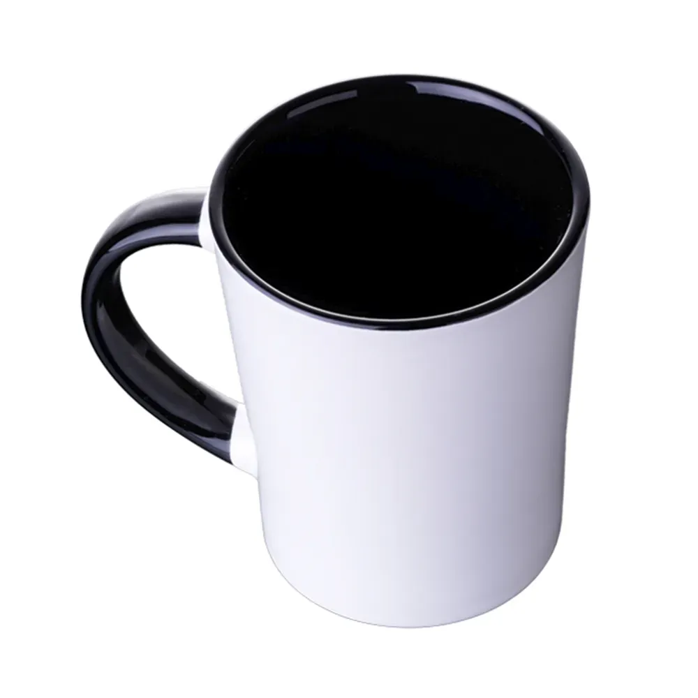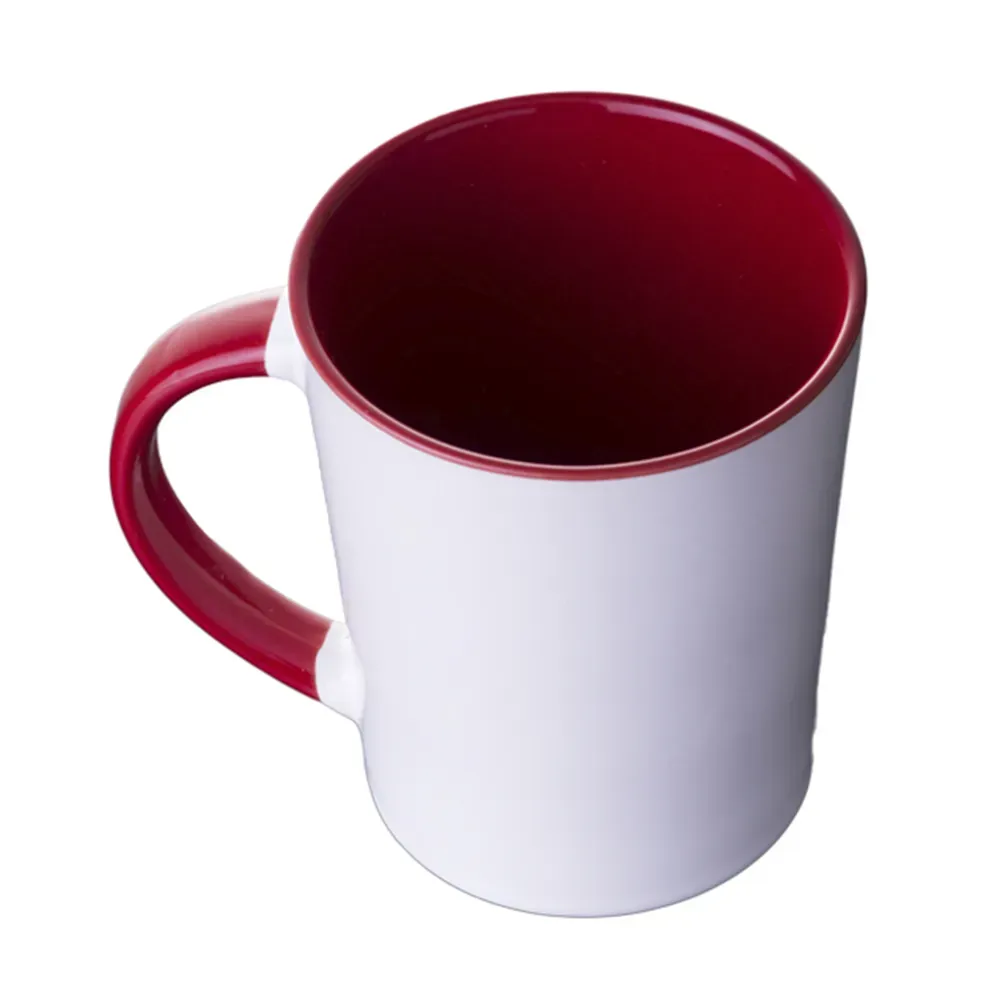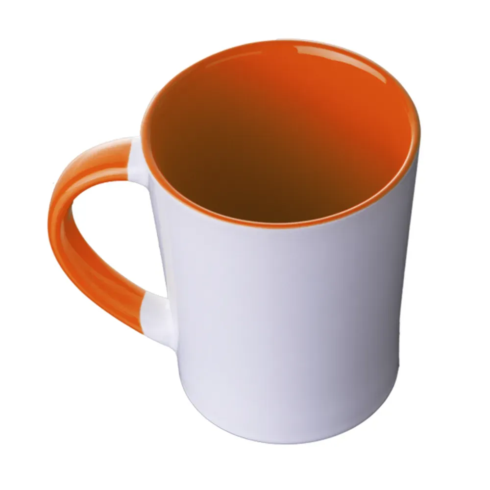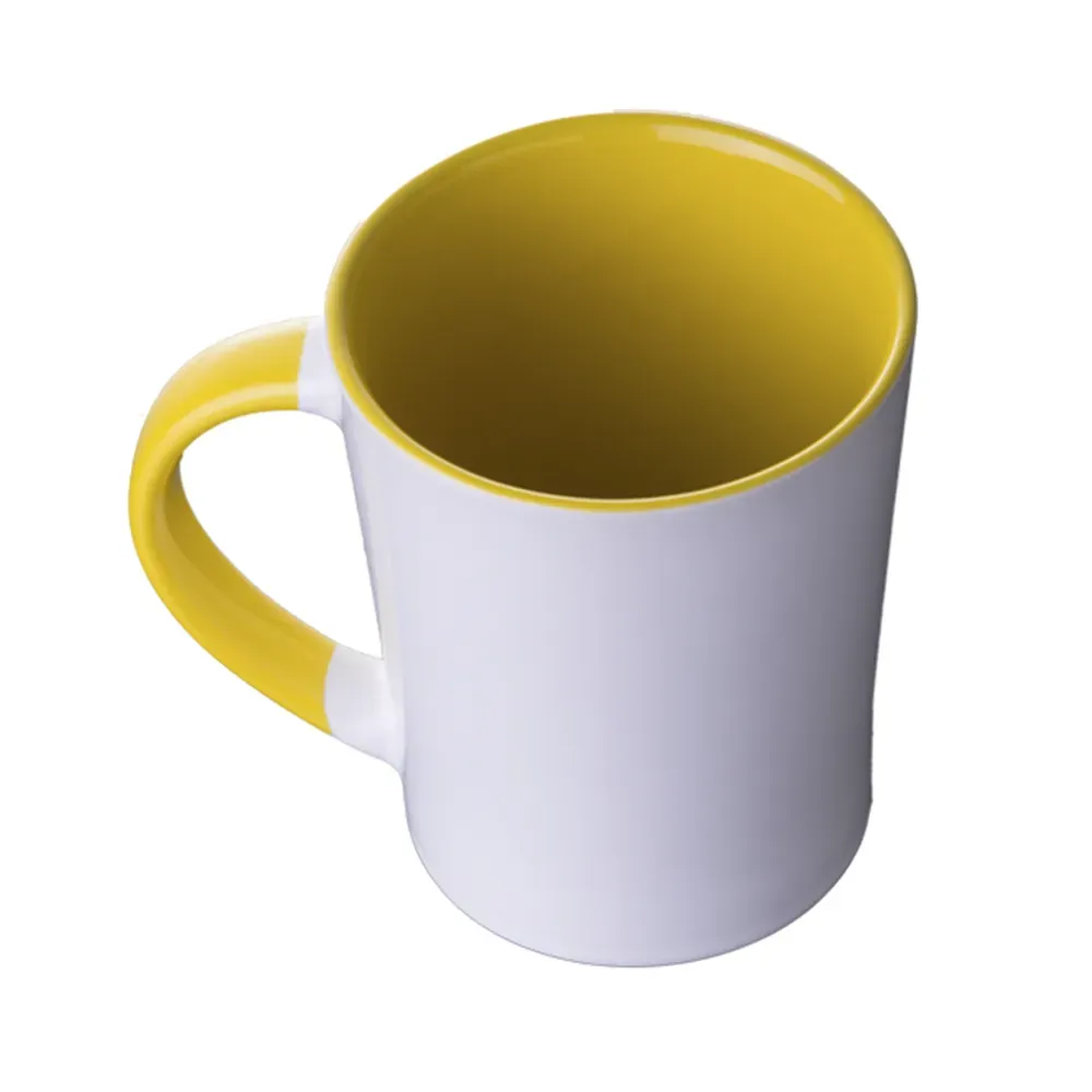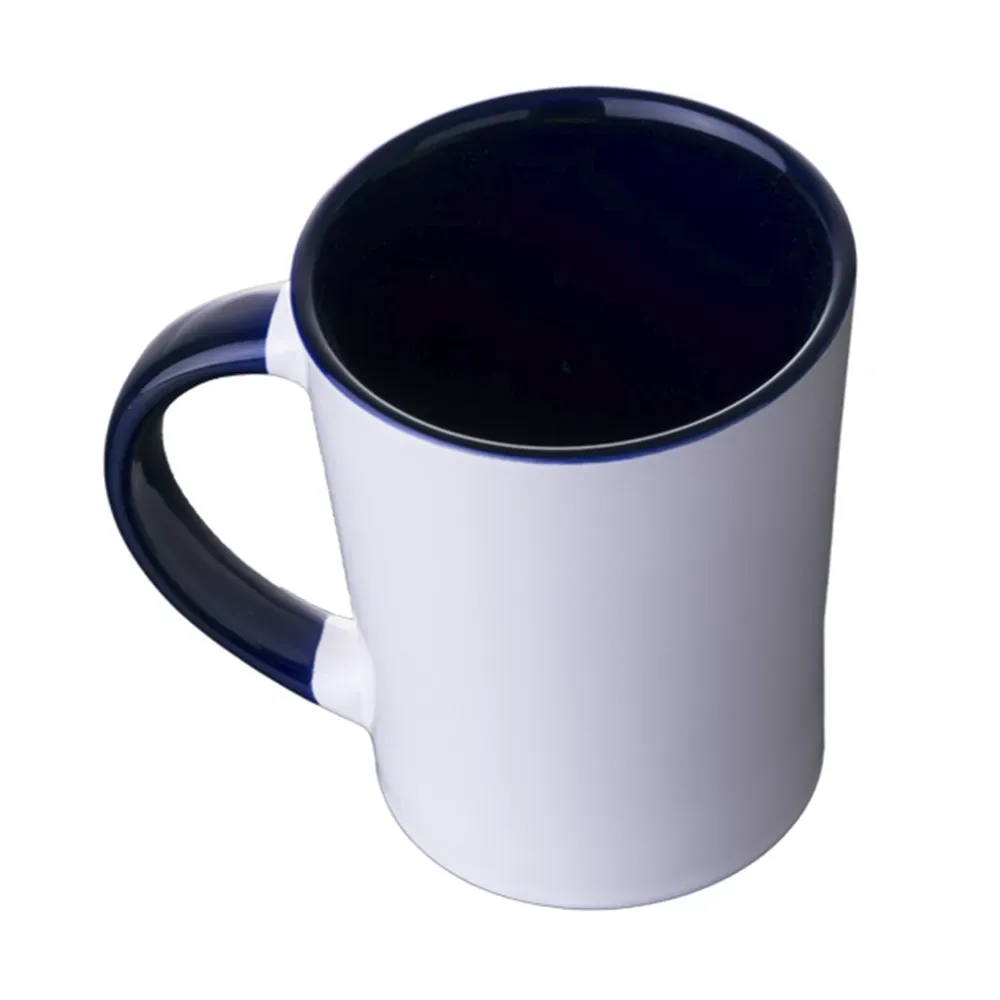 Taza de cerámica bicolor, forma cónica, con asa en combinación con color interior brillante, acabado liso vitrificado. CAP. 415 ml. (14 OZ). Venta en múltiplos de 12.