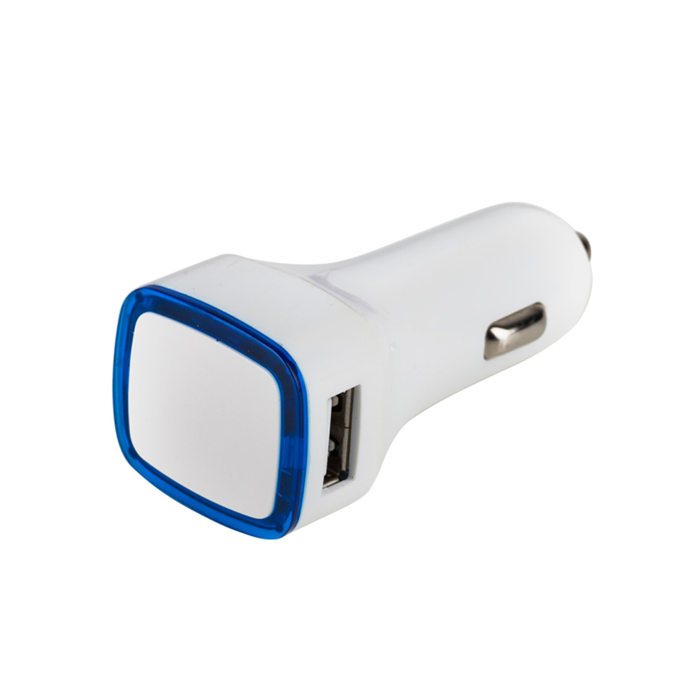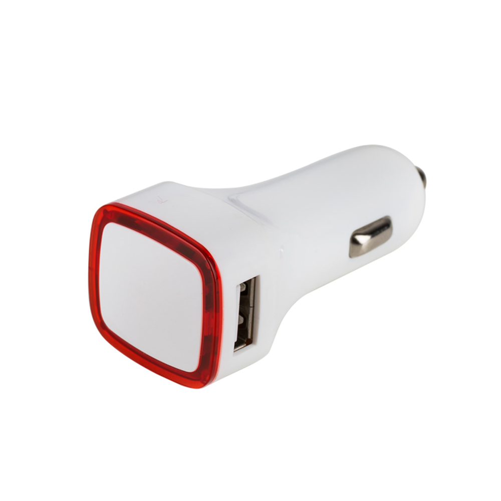 Cargador para automóvil con 2 entradas USB. Fino detalle de color traslúcido en contorno.