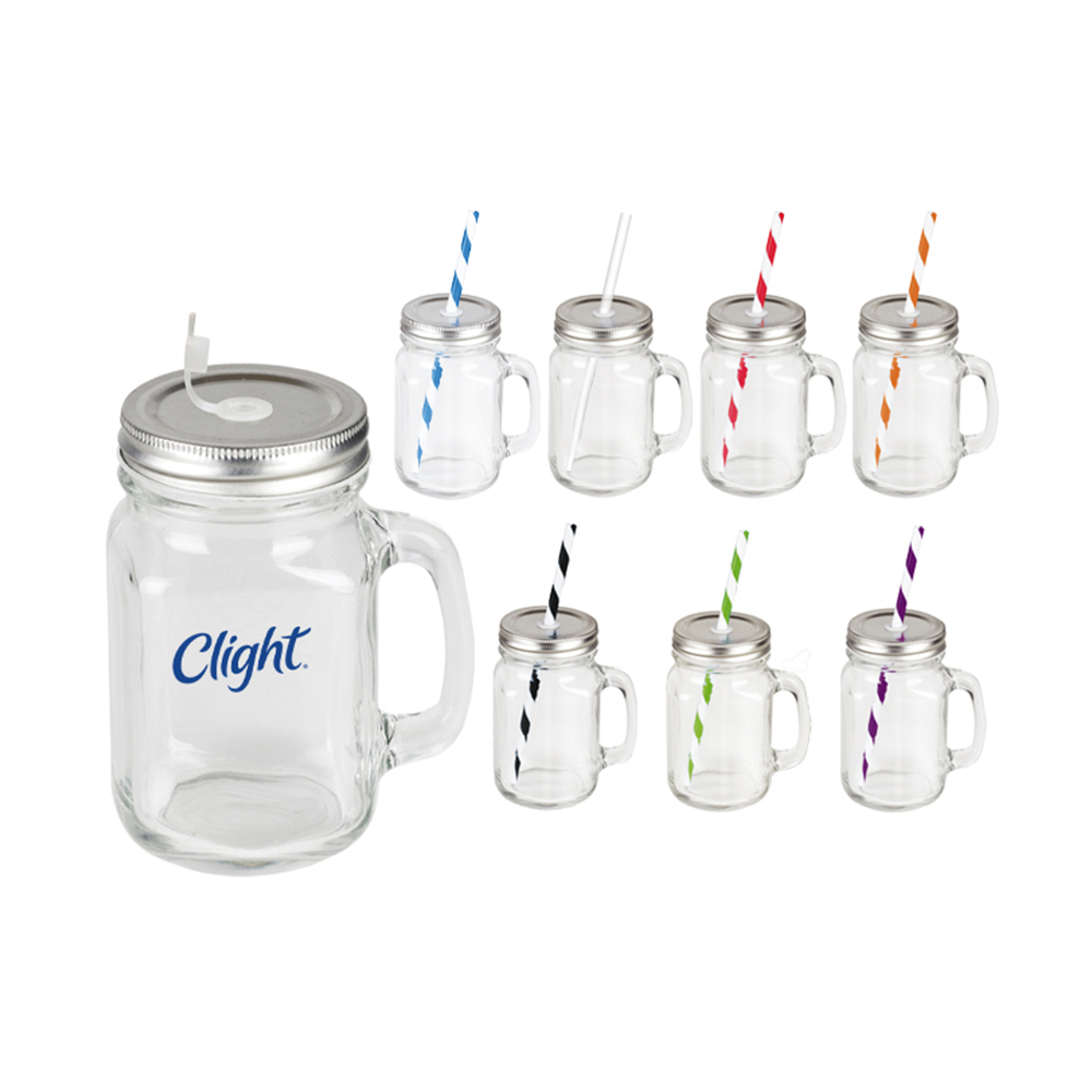 Práctico vaso de vidrio con asa y tapa de metal. CAP. 450 ml.