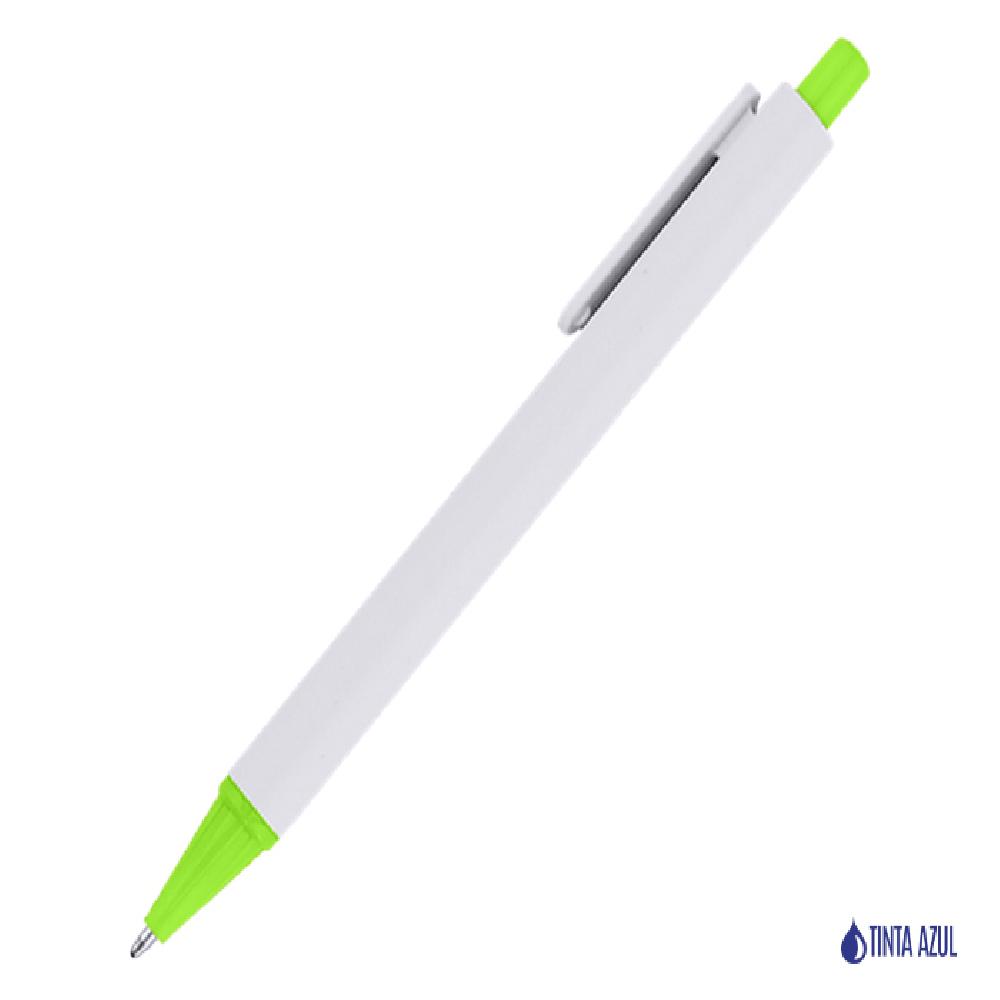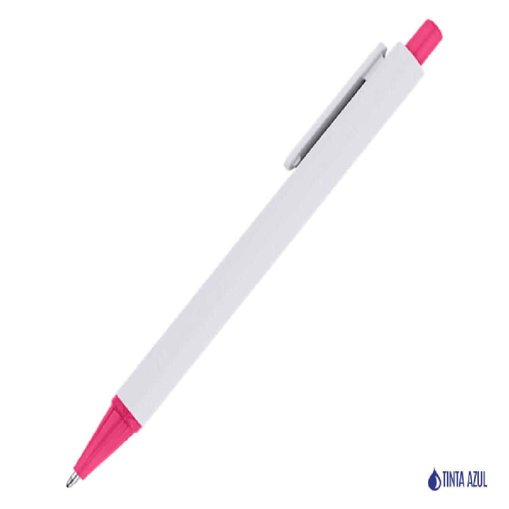 Bolígrafo de plástico de tinta azul, cuerpo blanco con punta y botón en color. Mecanismo de click.