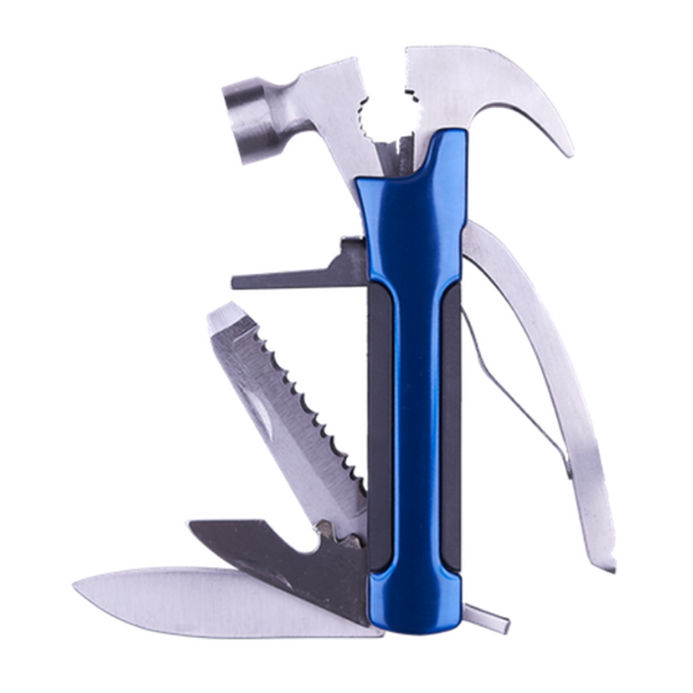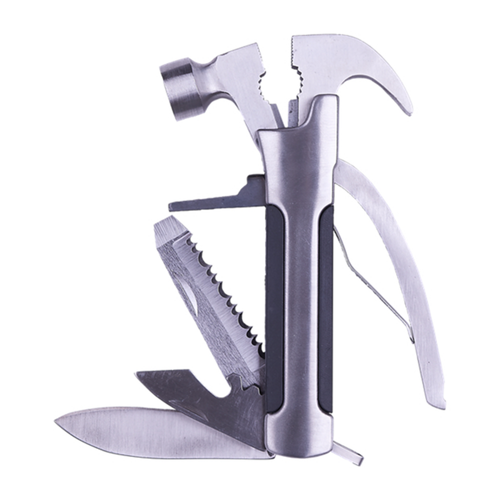 Completa herramienta plegable tipo martillo con 11 funciones. Incluye: martillo, pinzas, cortador de alambre, sacaclavos, 2 desarmadores planos, desarmador de cruz, destapador, lima, cuchillo y sierra. Cuenta con seguro de bloqueo para fijar las herramientas. Incluye estuche de tela en color negro.