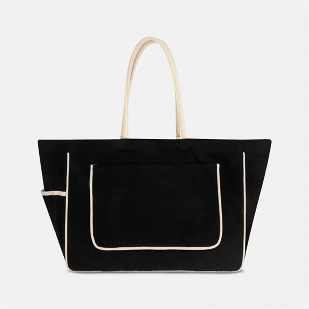 Bolsa ecológica cosida con diseño de ondas. Cuenta con compartimento exterior y asas. Peso máximo de carga 8 kgs.