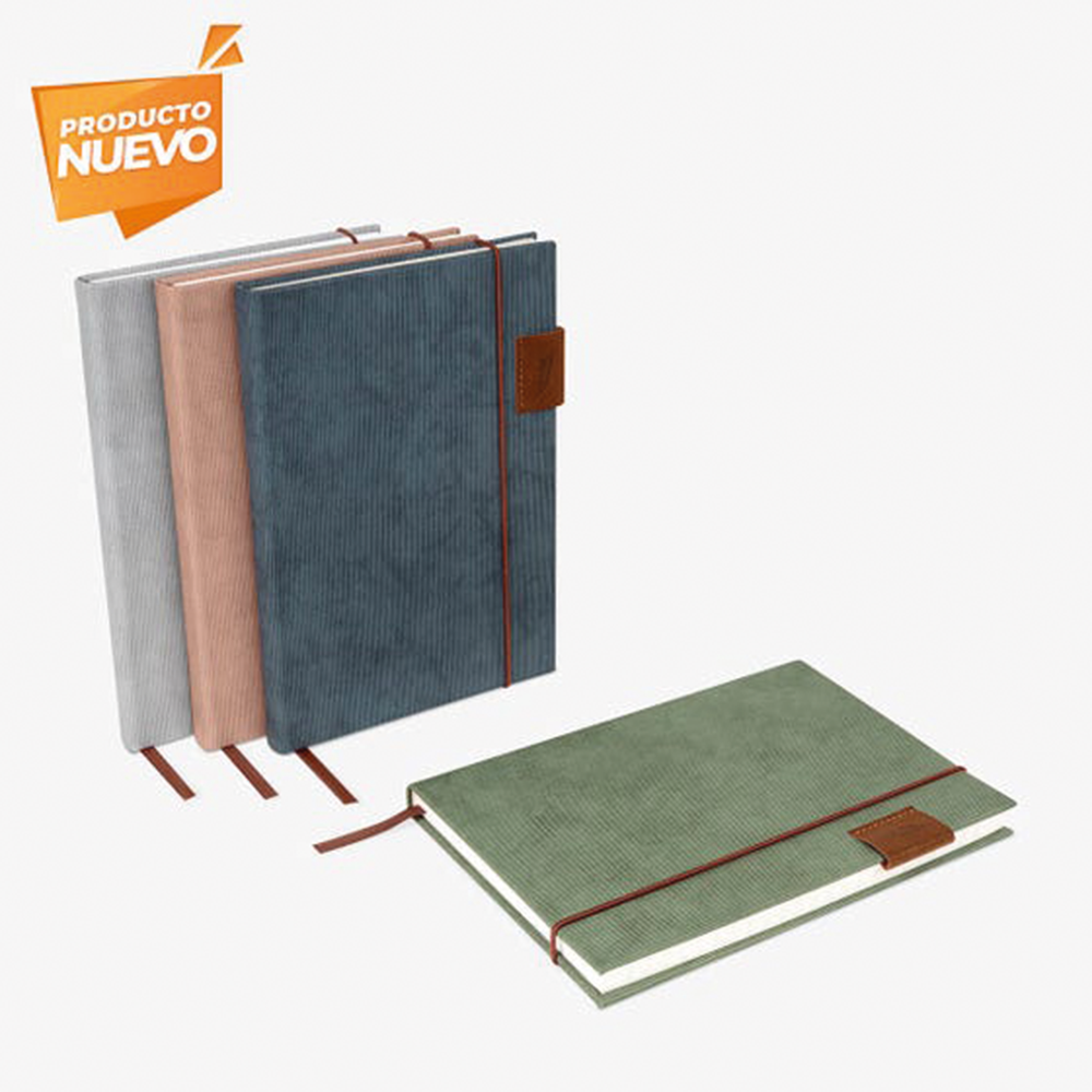 Libreta personal para bitácora tamaño A5 con 80 hojas rayadas (160 páginas). El grabado en láser revela el color a juego con la banda elástica para sujetar. Cuenta con separador de listón.