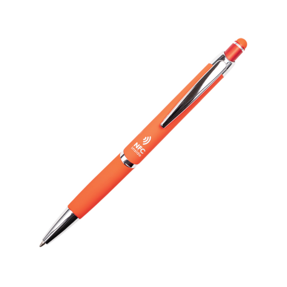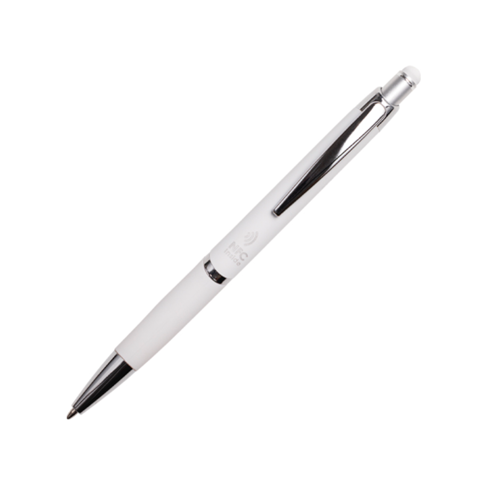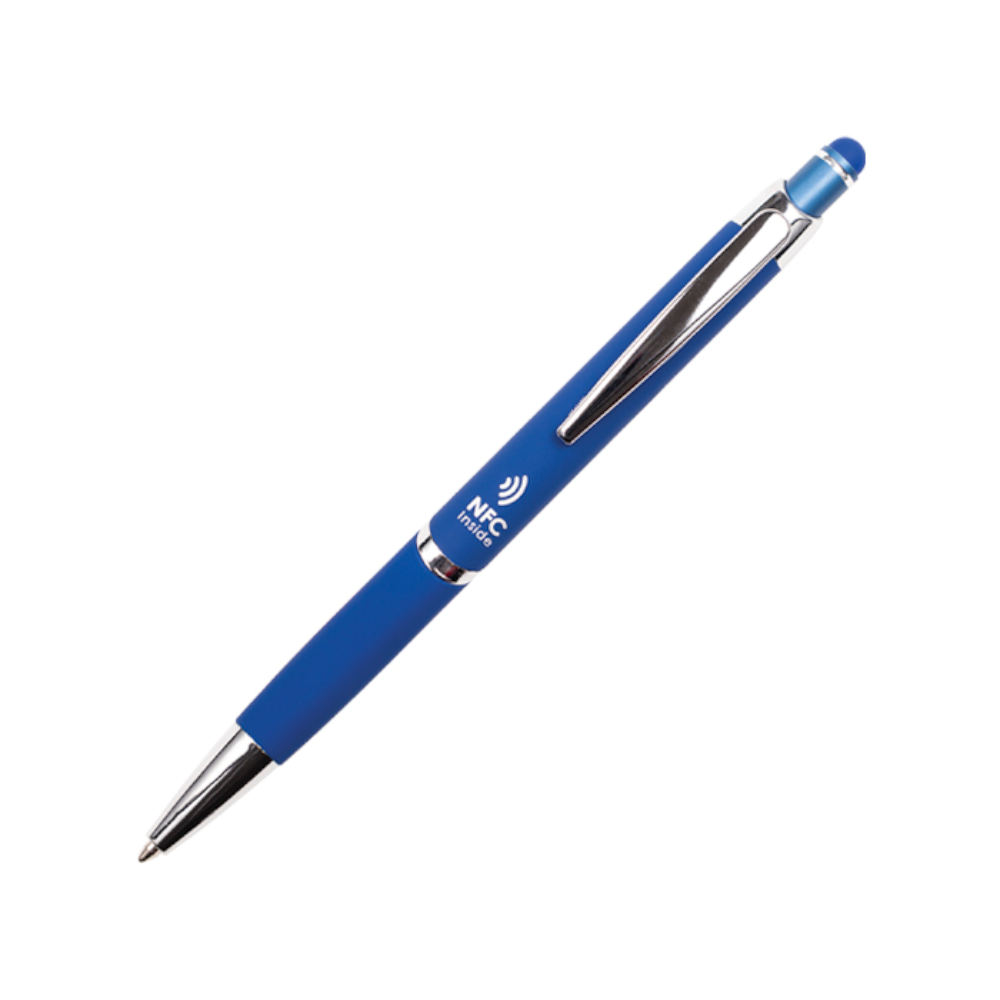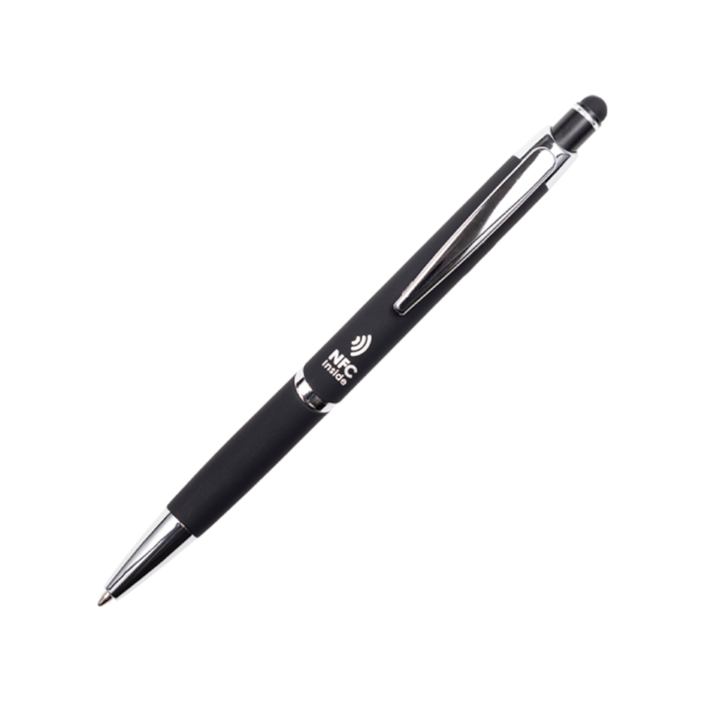 Bolígrafo de aluminio con acabado de goma suave al tacto y detalles en cromo. Cuenta con touch screen en la parte superior del color del bolígrafo y mecanismo de click. Al grabar destapa en color plata. Repuesto en tinta negra alemana de 1 mm. Tiene una etiqueta NFC en su interior que enlaza la información rápidamente a la aplicación de NFC, compatible con todos los celulares Android e iOS que cuenten con esta aplicación disponible.