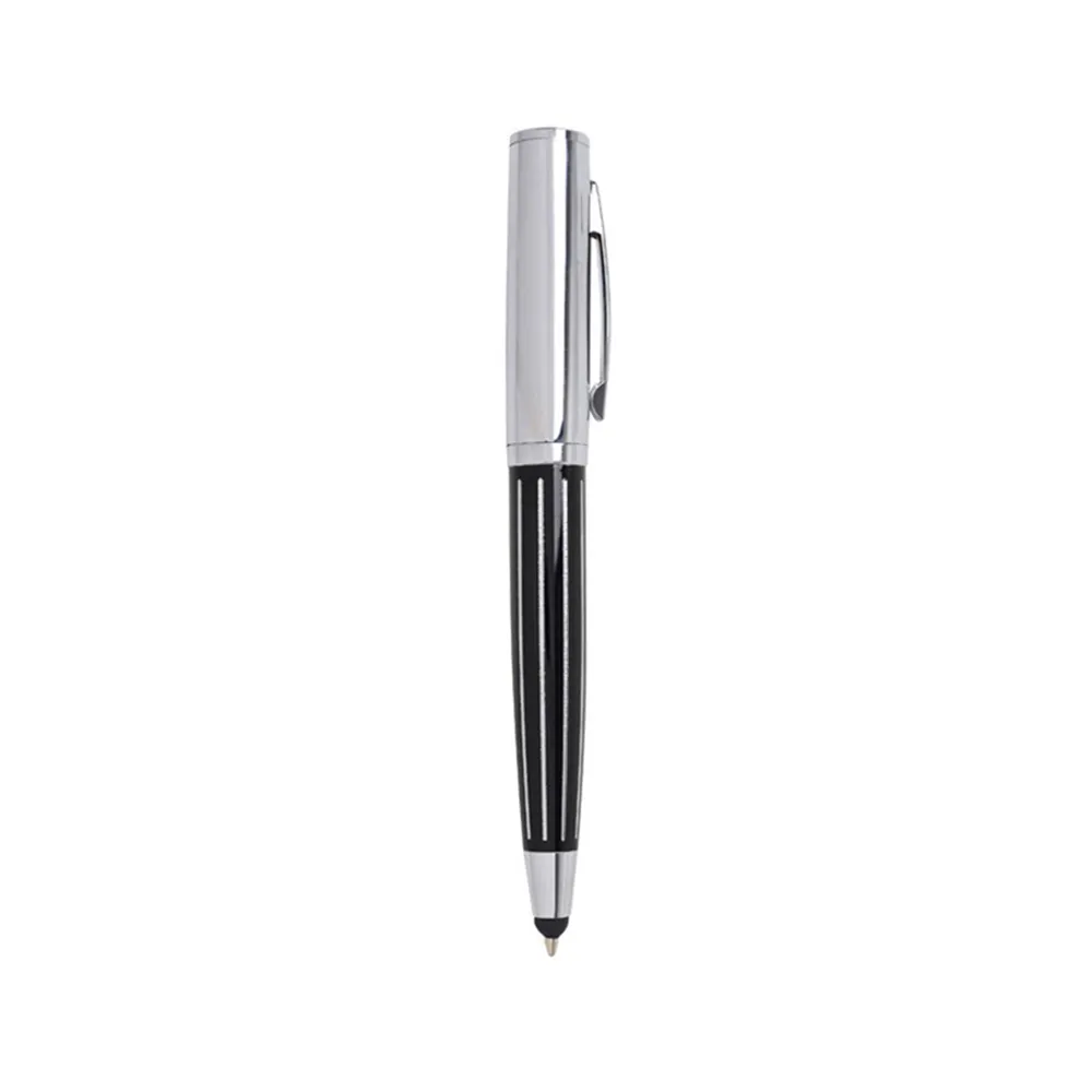 Bolígrafo de aluminio con mecanismo de click, acabado de goma suave al tacto y detalles en oro rosa (punta, clip y botón). Al grabar en laser CO2, destapa en color oro rosa.