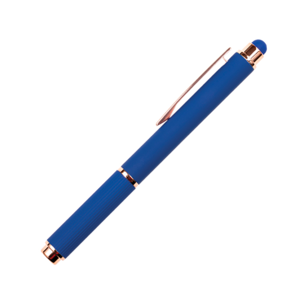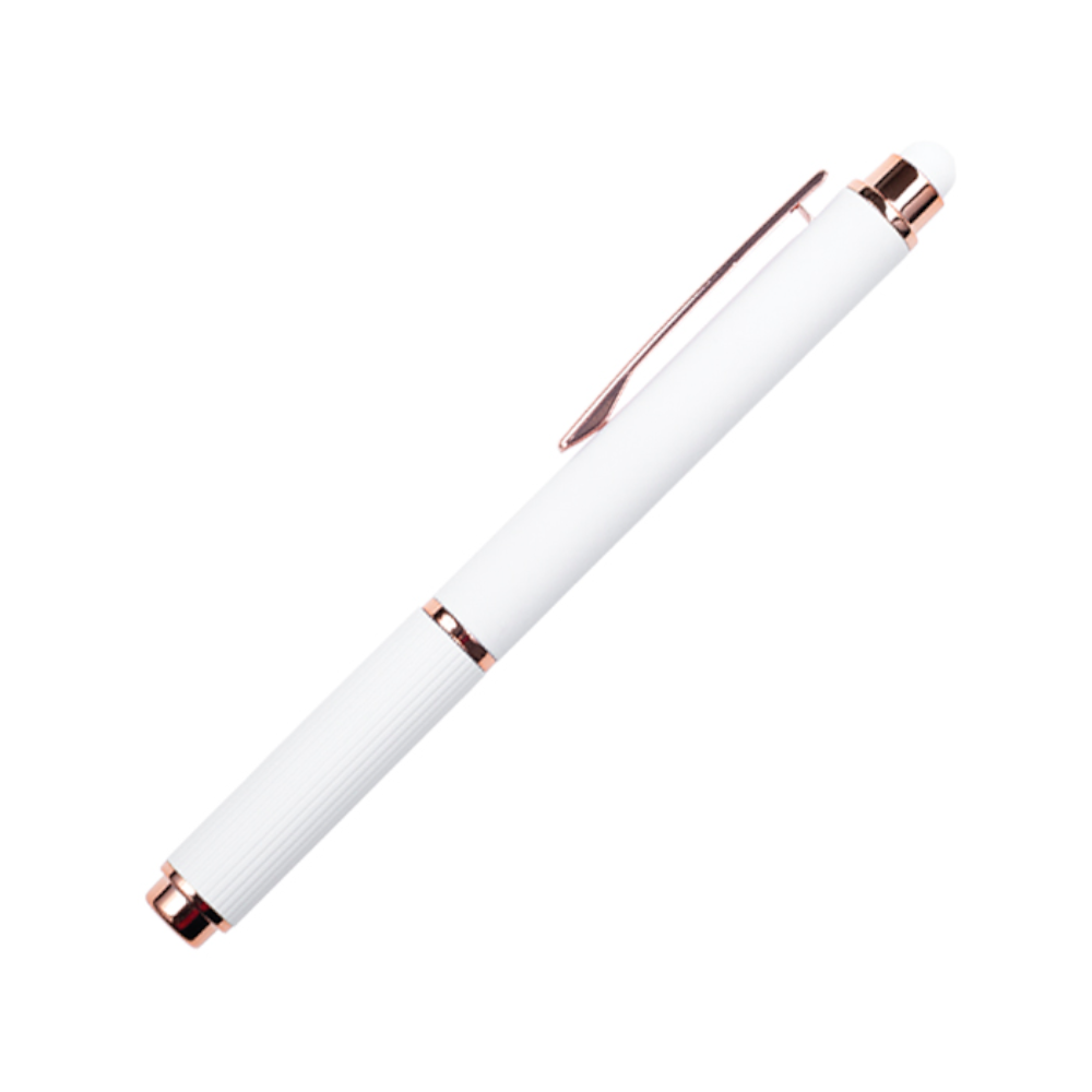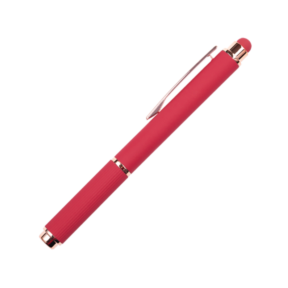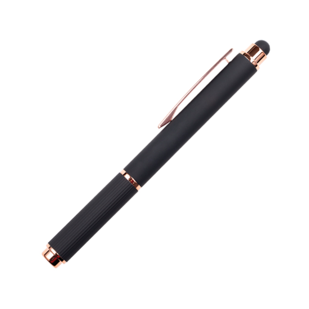 Bolígrafo de aluminio tipo roller, con acabado de goma suave al tacto y detalles en oro rosa. Cuenta con touch screen en la parte superior del color del bolígrafo y su tapa cuenta con sutiles líneas verticales. Al grabar en laser CO2, destapa en color oro rosa.