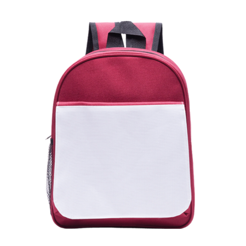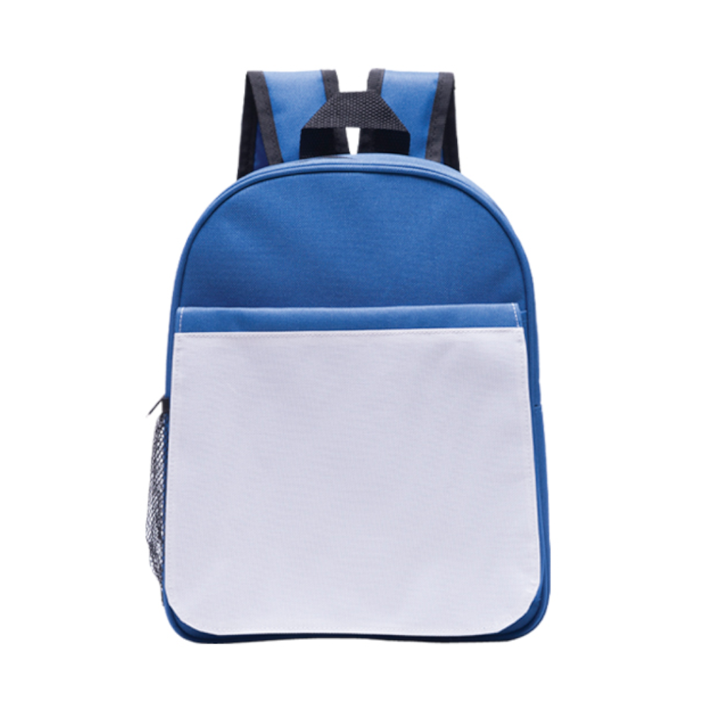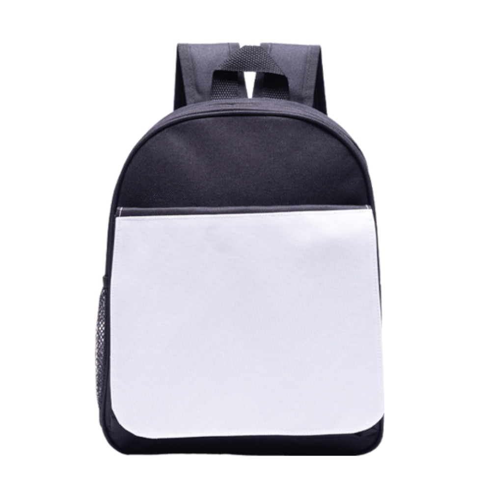 Mini mochila con solapa desmontable para sublimación, con cierre y broche de pegol, asa y correas ajustables, cuenta con un compartimento frontal y 2 bolsas laterales de malla con resorte.