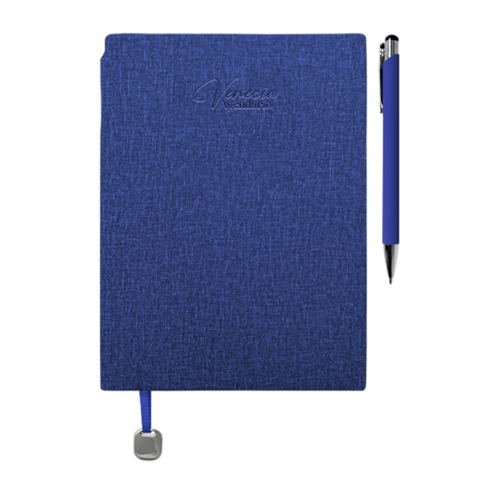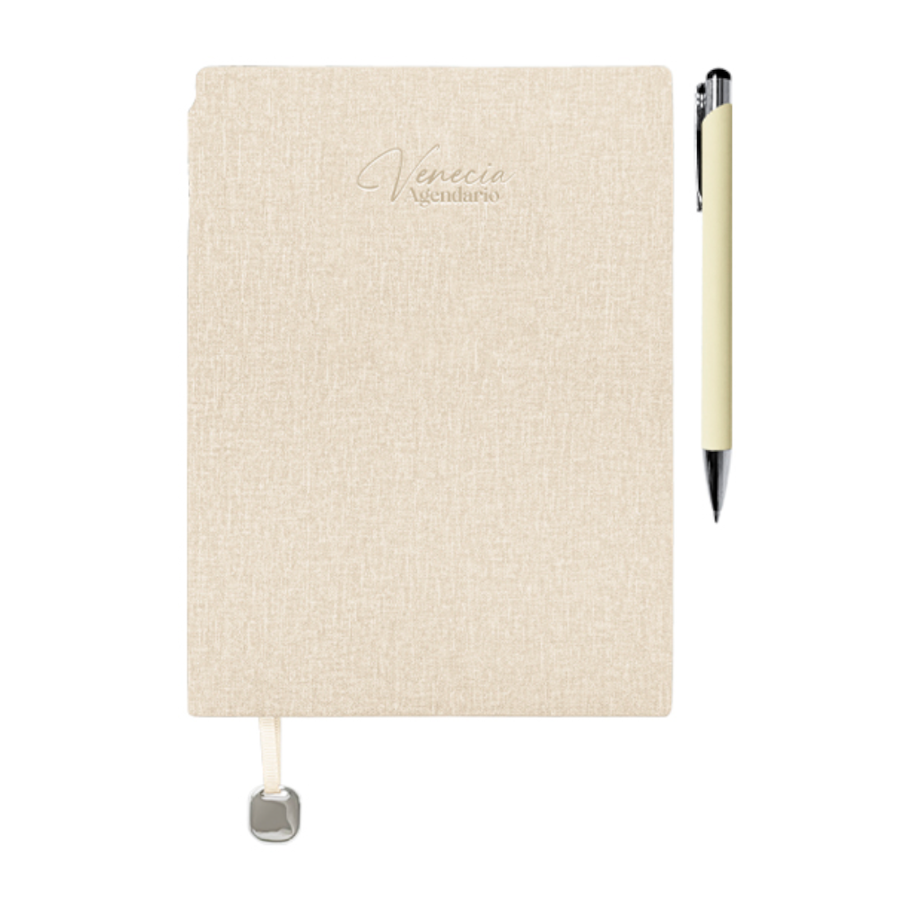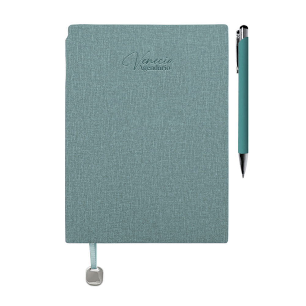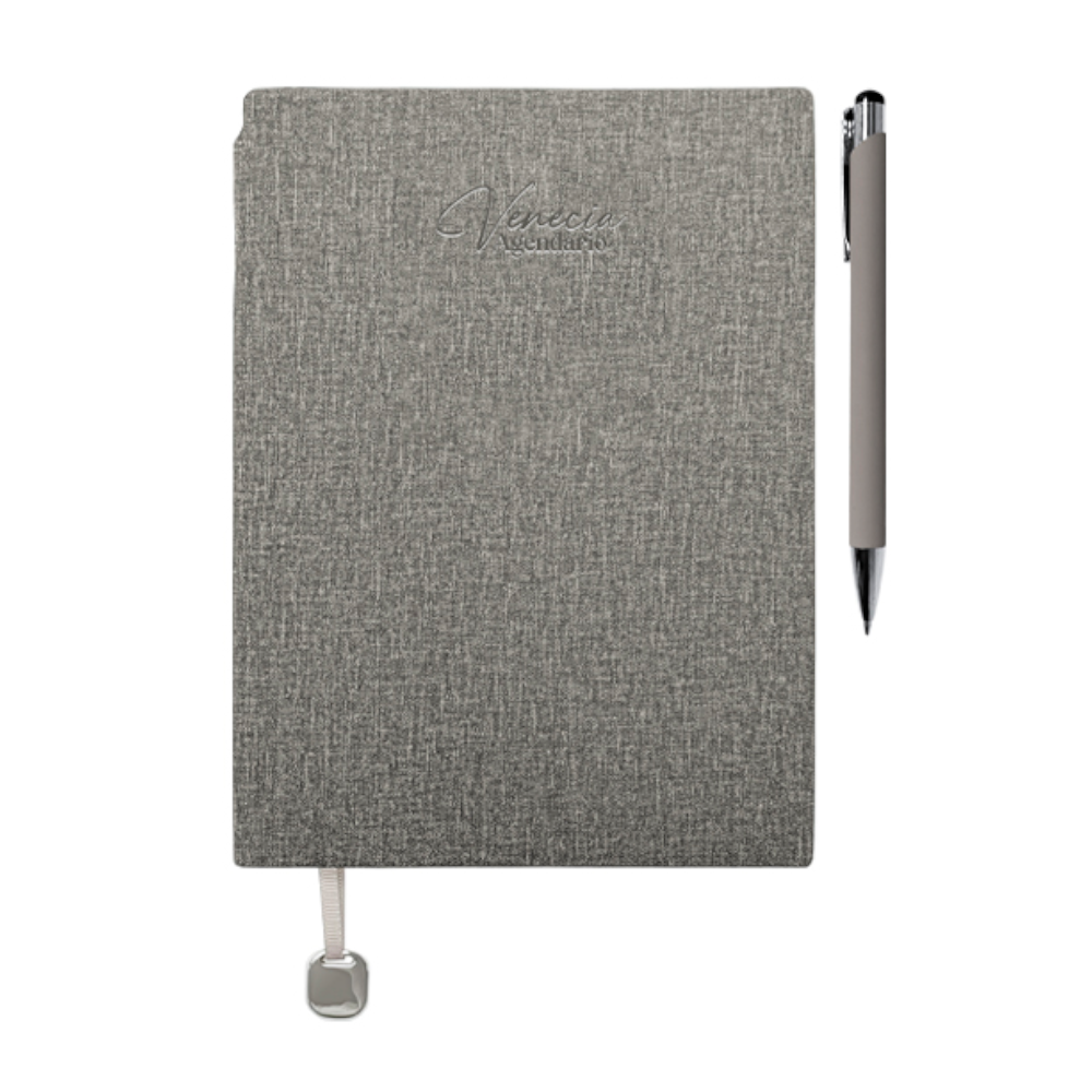 Agendario de pasta flexible texturizada de 112 hojas (224 páginas), contiene: cuadro de dedicatoria, hoja de datos, calendarios de 2026 a 2029, planificador anual (4); planificador de gastos (4); planificador de proyectos (5), agendario, hoja para notas punteada y listón separador con placa metálica. Incluye: Bolígrafo de aluminio del color de la libreta con mecanismo de click. El bolígrafo se puede insertar en el lomo de la libreta para transportarlo de forma segura.