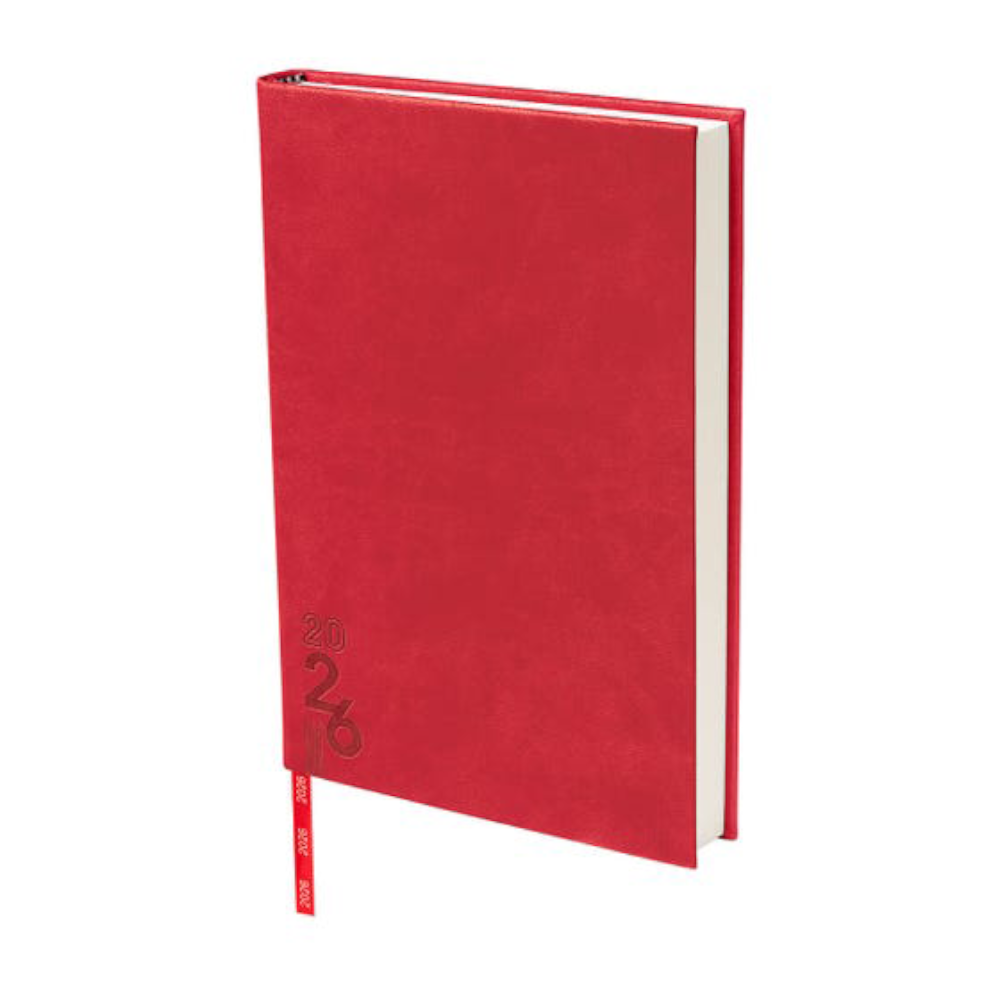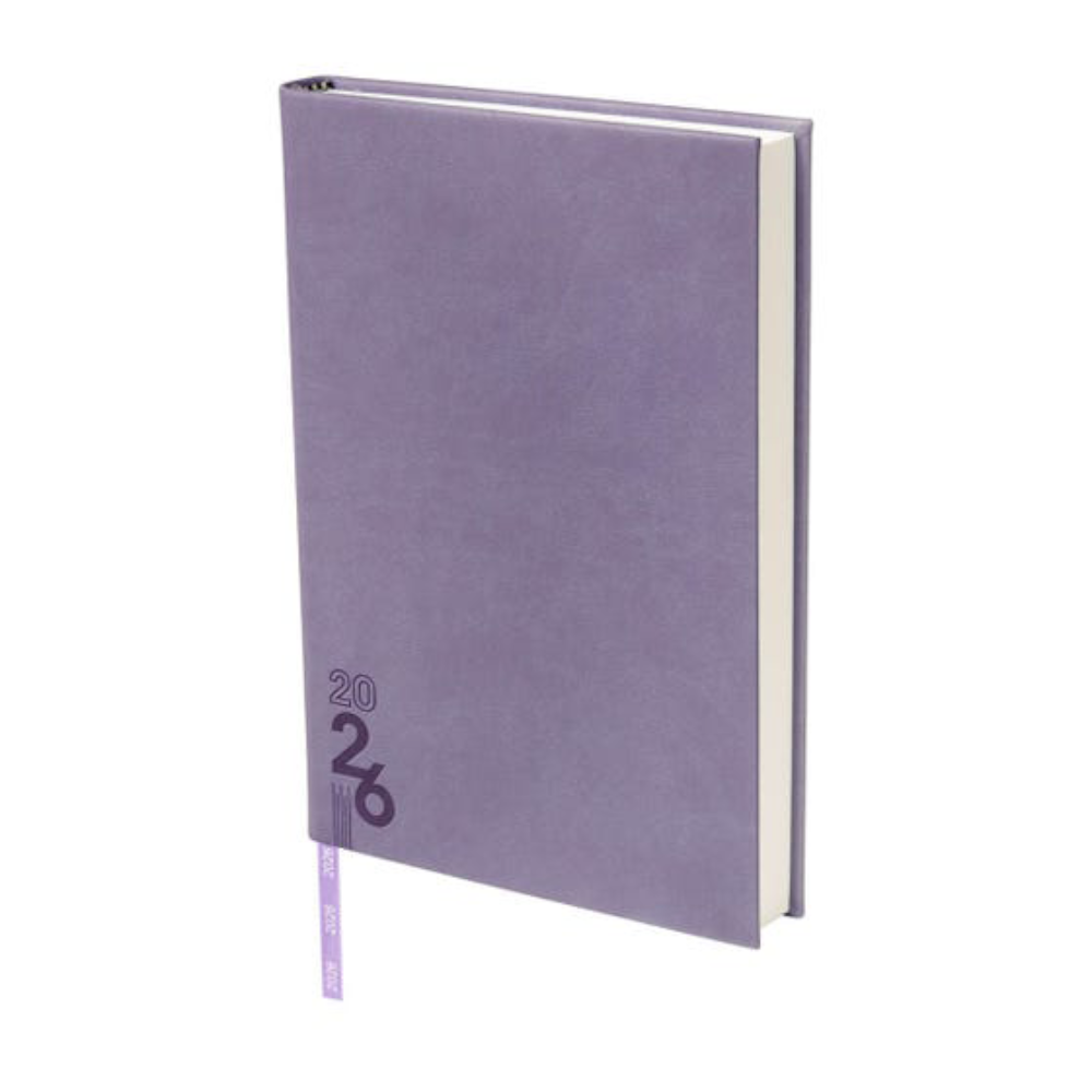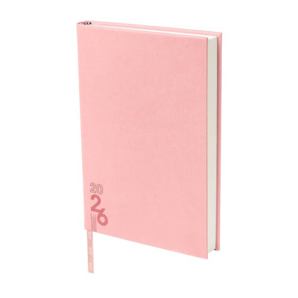 Agenda diaria con 186 hojas. Contiene datos personales, calendarios 2025-2026-2027, planeador 2026, seguimiento de nuevos hábitos, organizador de tareas, planeador de proyectos y días festivos. Incluye caja individual del mismo color a la agenda.