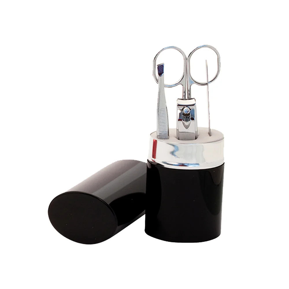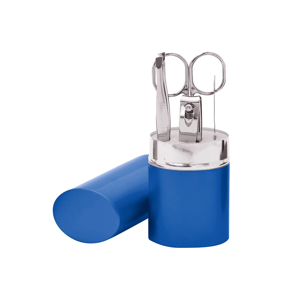 Set de manicura en estuche ovalado de metal, con 4 piezas (cortaúñas, lima de metal, pinzas para cutículas y tijeras).