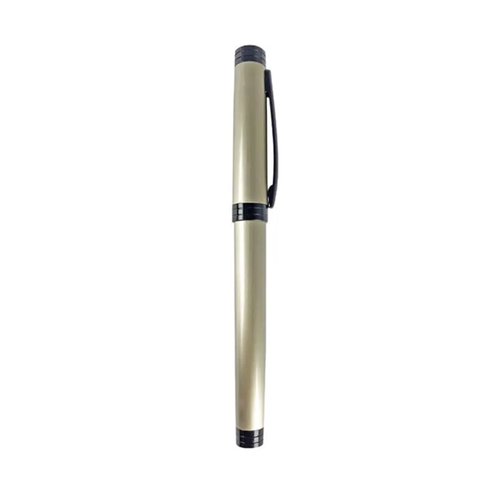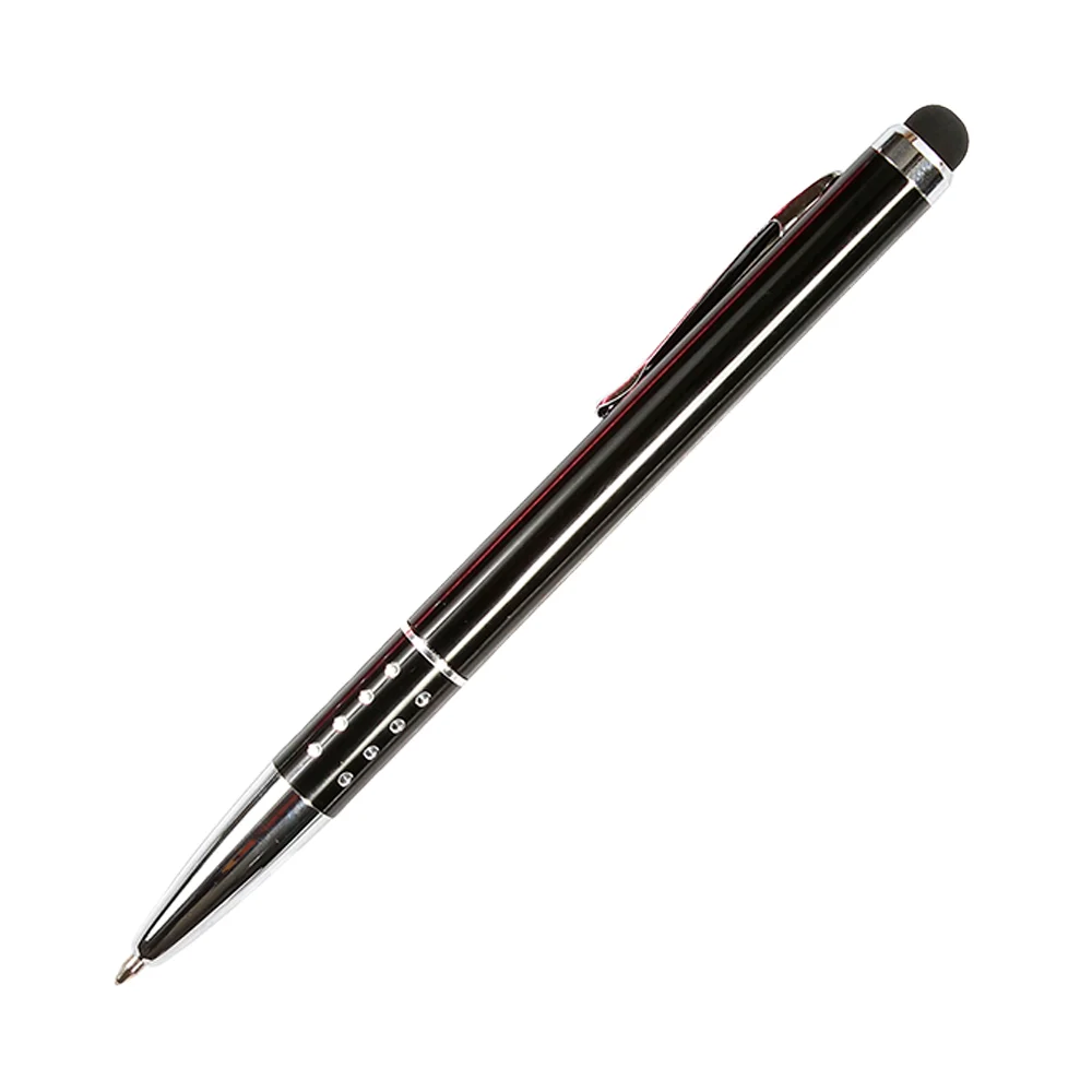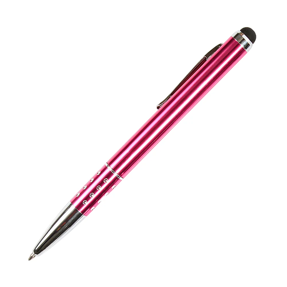 Bolígrafo metálico con puntero touch, clip y punta con acabado metálico, detalle tipo piedra brillante en grip y estuche triangular de plástico transparente. Tinta de escritura negra