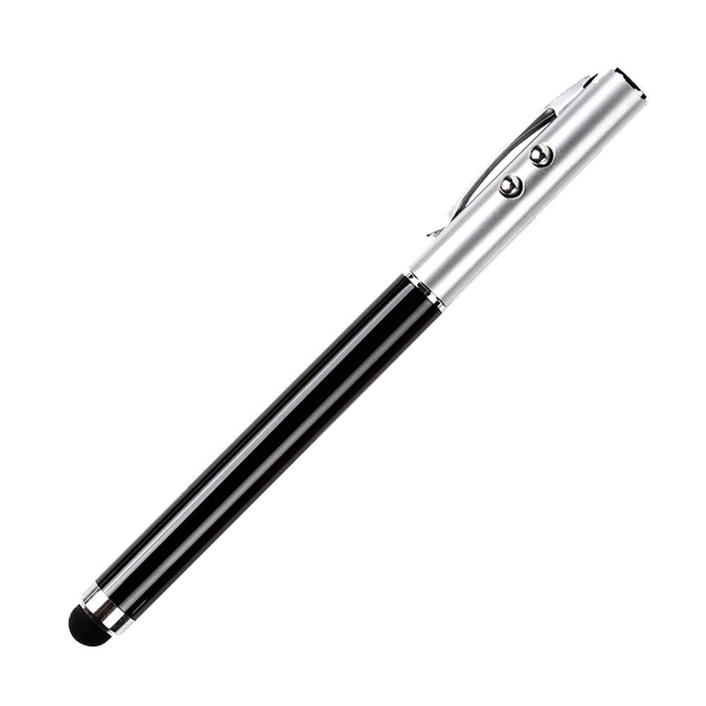 Bolígrafo metálico multifunciones, luz led, señalador láser, puntero touch y tinta negra. Incluye estuche individual