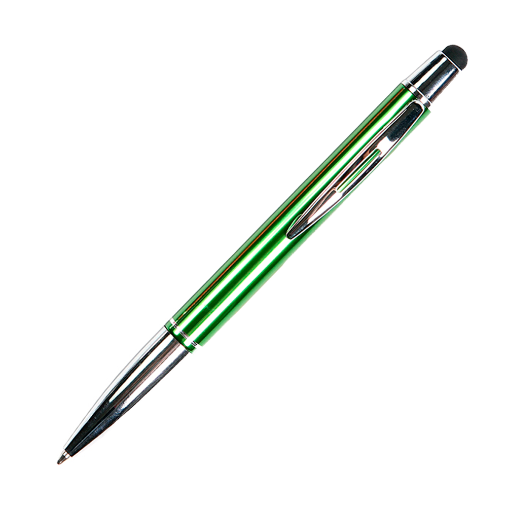 Bolígrafo metálico con puntero touch, clip, punta y detalles cromados. Tinta de escritura negra
