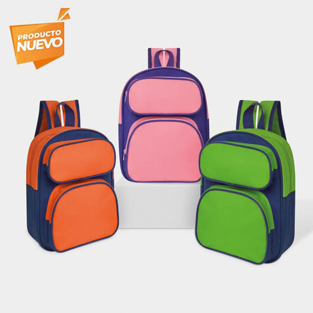 Mochila con compartimento principal, bolsa frontal, correas ajustables y asa superior para agarre.