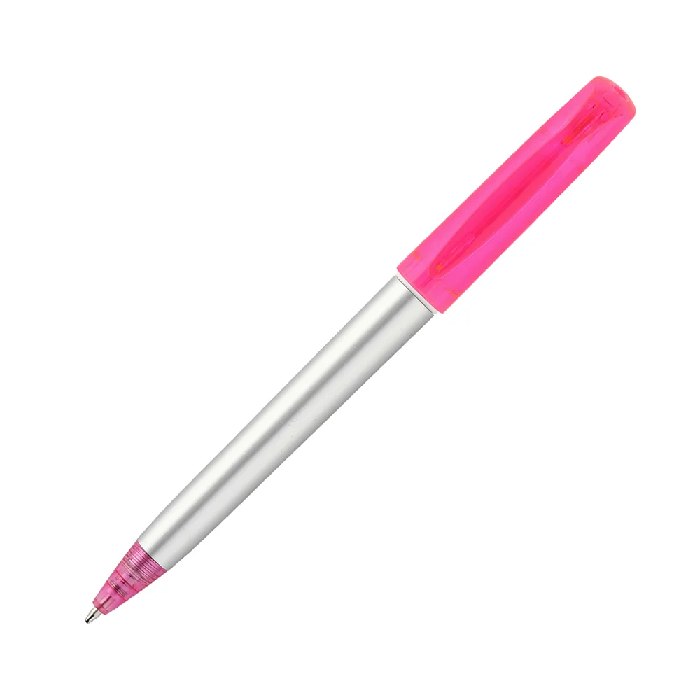 Bolígrafo twist fabricado en ABS, con apariencia metálica y marca textos con tapa de color translucida. Tinta de escritura negra