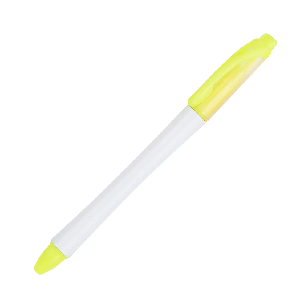 Bolígrafo 2 en 1 con marca textos; barril plástico color blanco, tapa en la parte superior translucida con detalles de color en clip y punta. Tinta de escritura negra