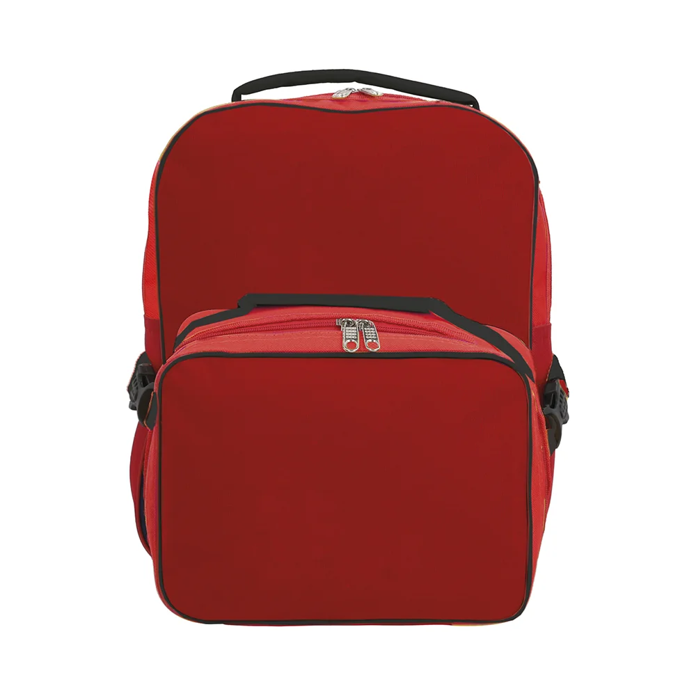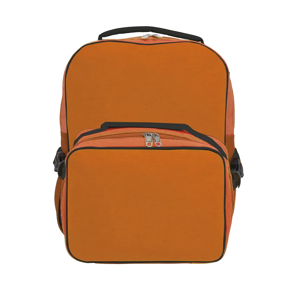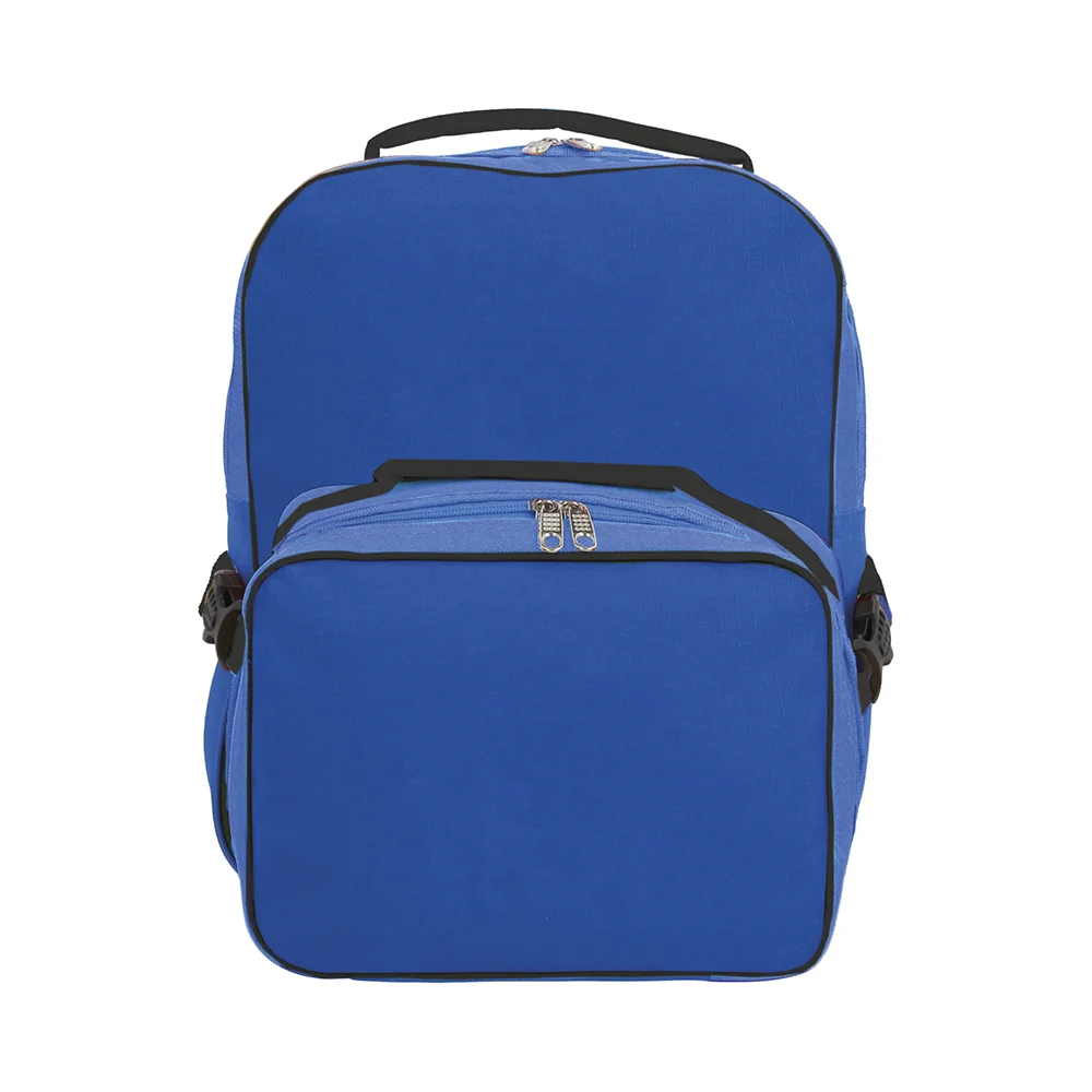 Mochila escolar con compartimento principal, mallas laterales, 1 bolsa frontal y asa. Incluye lonchera.