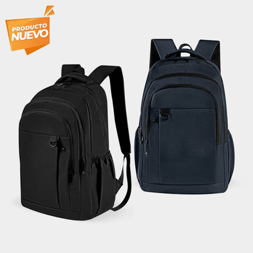 Mochila con compartimento principal con porta laptop de 17.5 pulgadas, compartimento secundario con organizador interno, bolsa frontal con cierre, dos bolsas laterales con banda elástica, respaldo acolchado con banda carry-on, tirantes con broche y asa superior metálica.