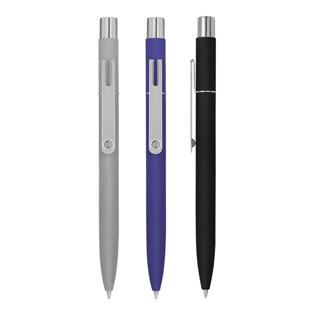Cuerpo color negro engomado. Pulsador, clip y punta plata. Tinta negra. Decape plateado