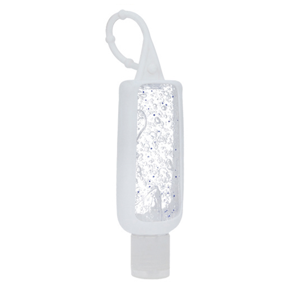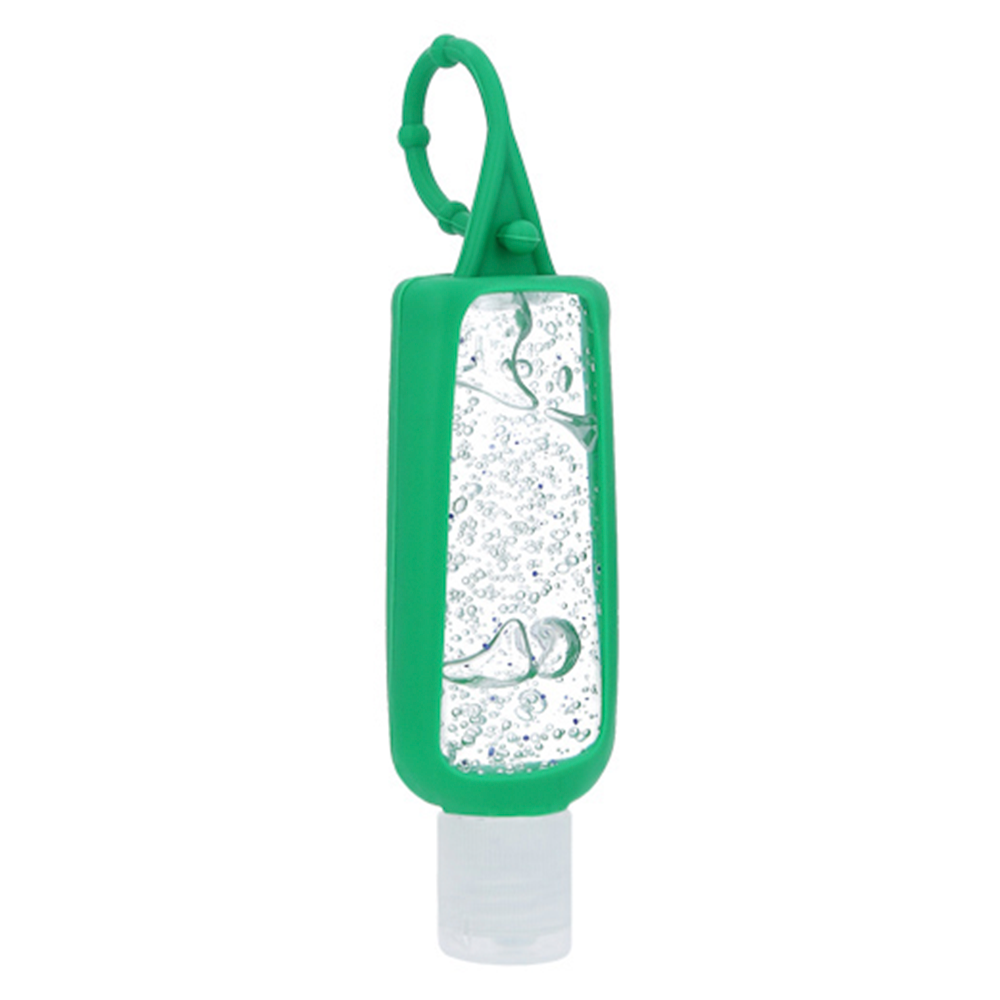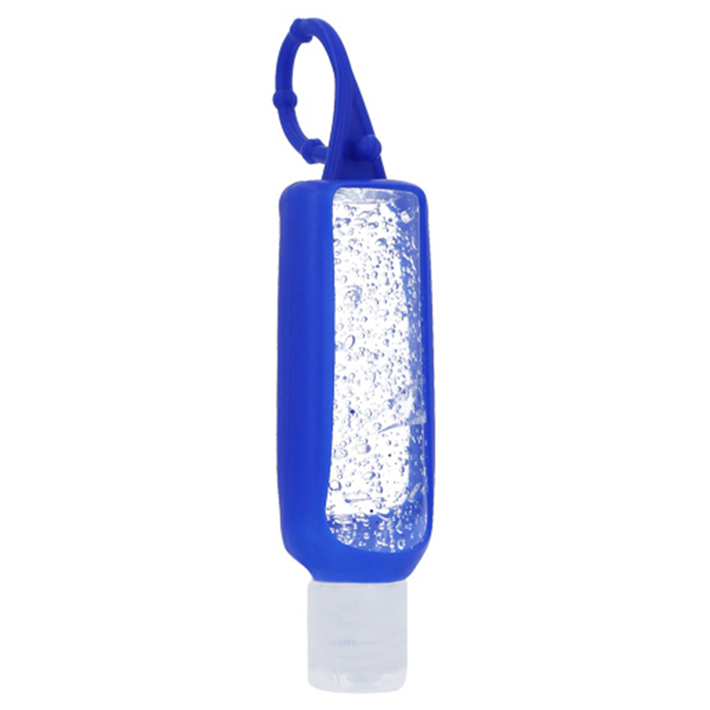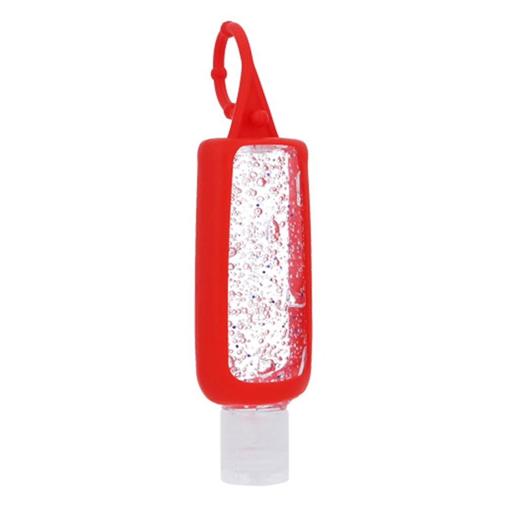 Gel antibacterial en botella de plástico con funda de silicón.