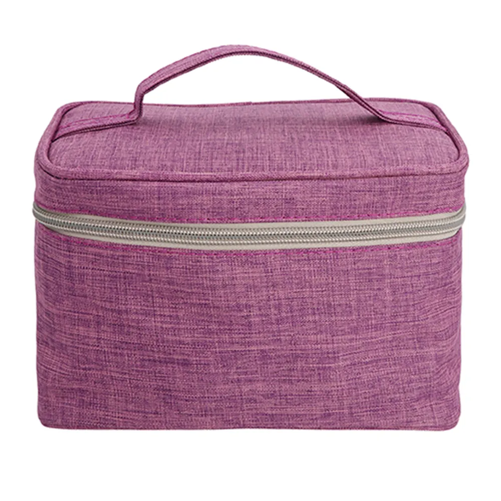 Cosmetiquera de poliéster en forma rectangular con dos compartimientos y asa.