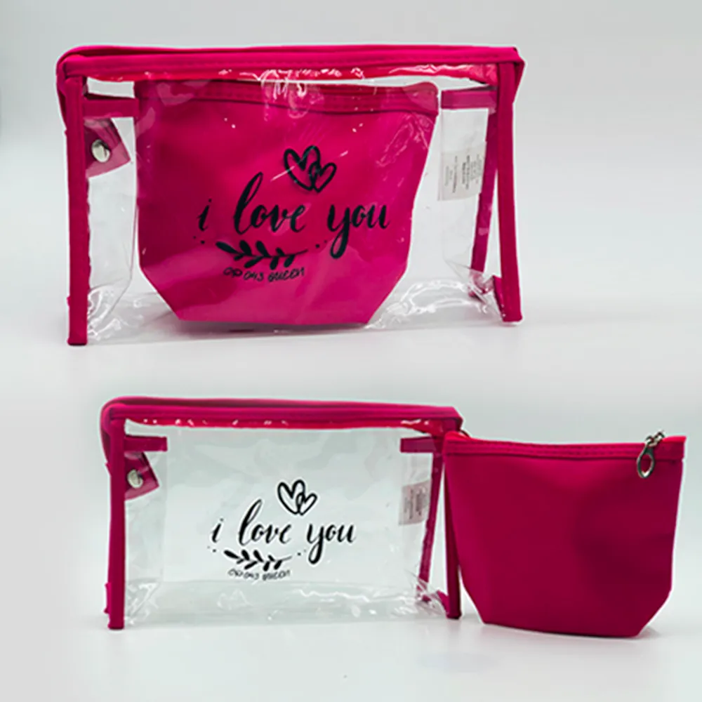 Cosmetiquera de plástico con cierre, asa y broche, que en el interior incluye mini cosmetiquera de poliéster con cierre.