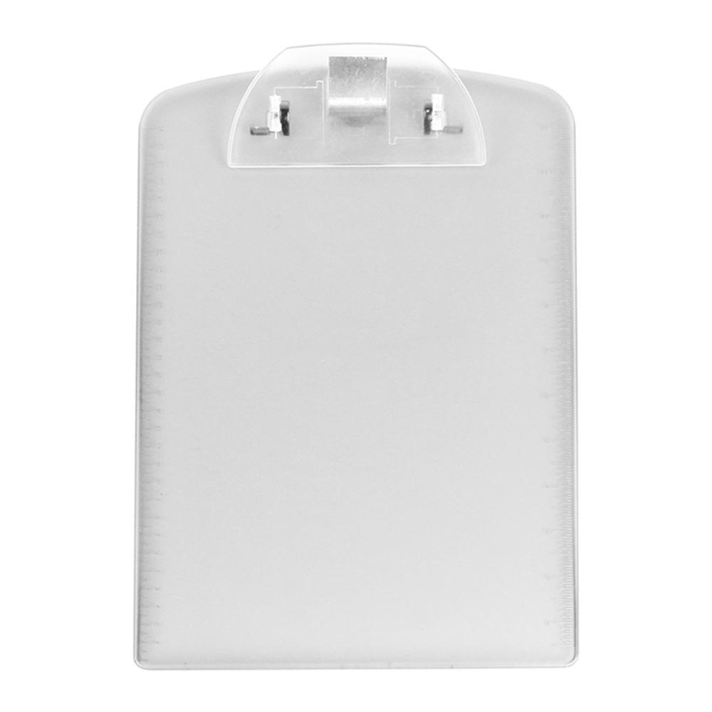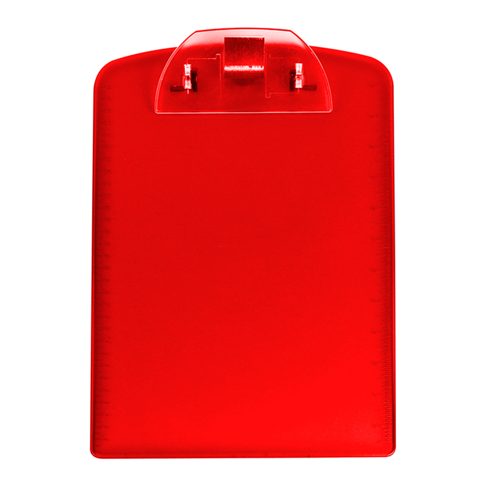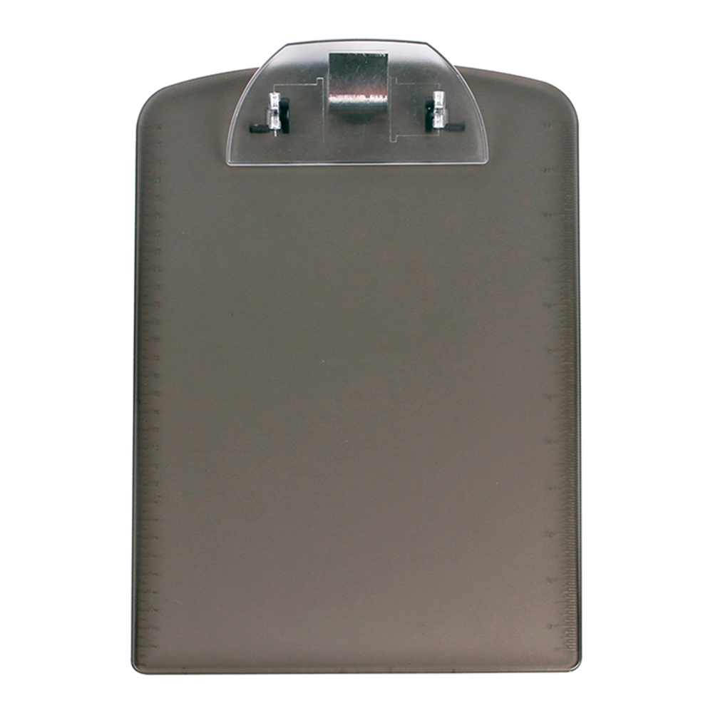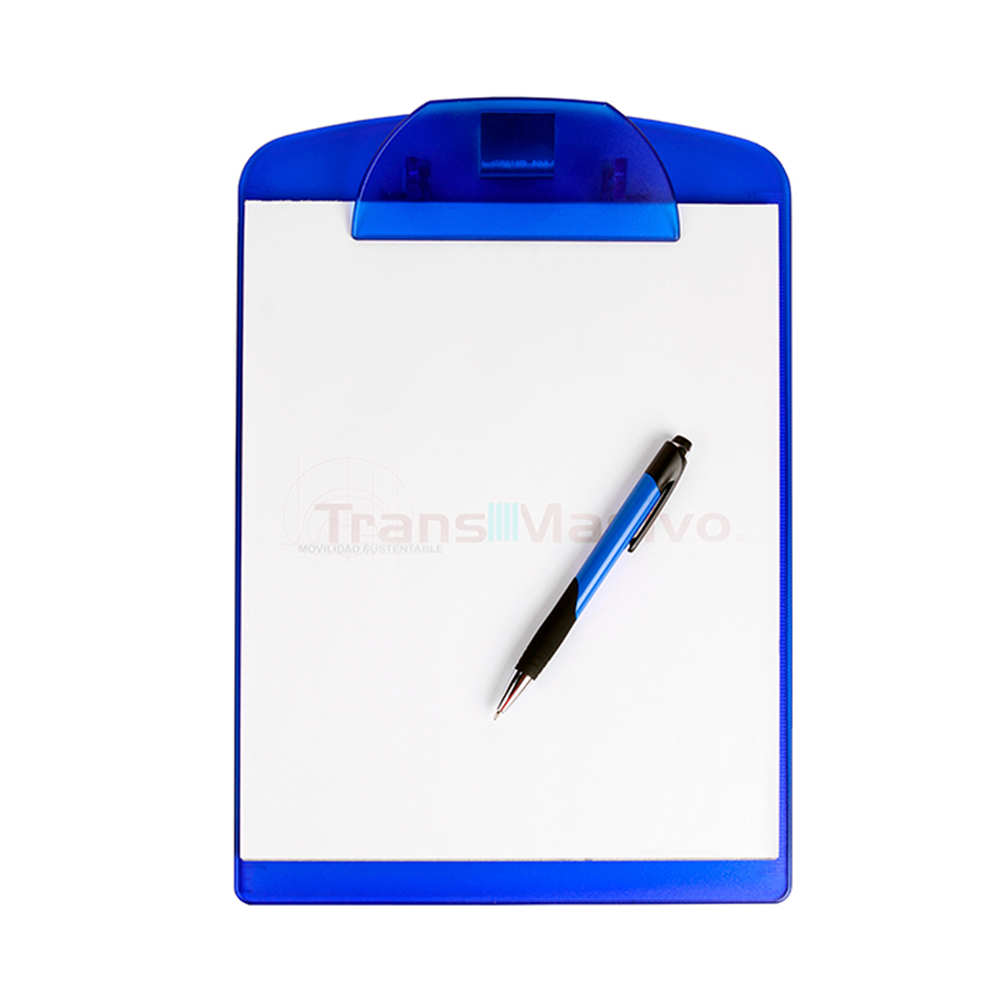 Tabla de plástico translucido con clip para documentos y regla en las orillas. No incluye pluma.