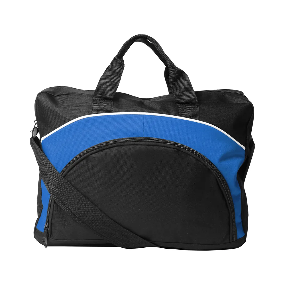 Portafolio ejecutivo fabricado en poliéster con cierre al frente y compartimentos interiores, con asas y correa de hombro ajustable.