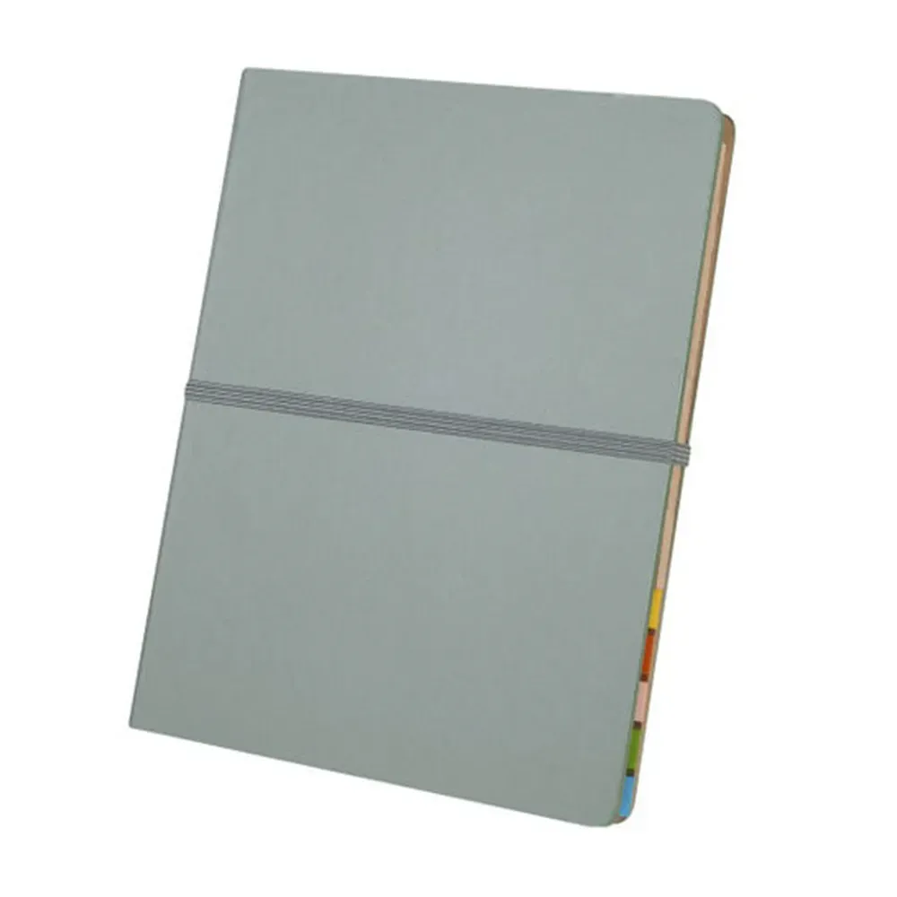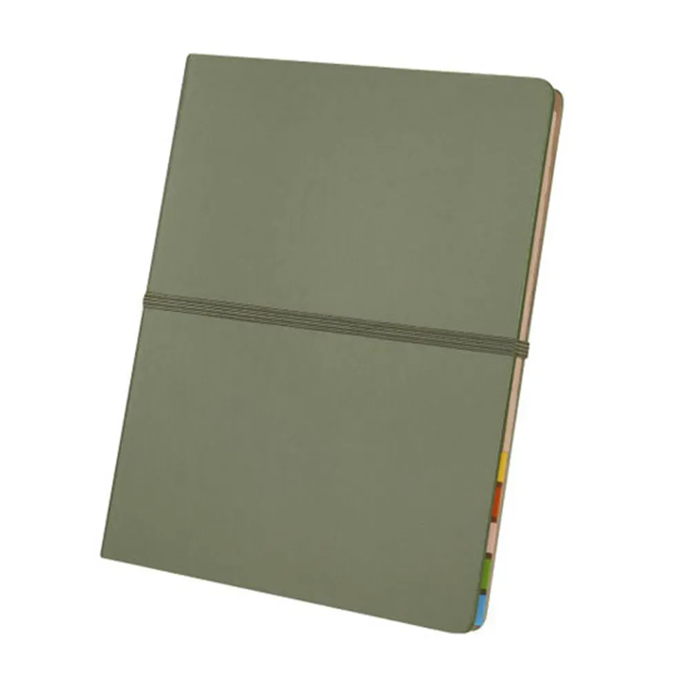 Planeador de prioridades y tareas. En su interior incluye un bolígrafo metálico, un sobre de papel para almacenar o proteger documentos, un block de 70 hojas de papel Kraft con diseño de raya, 3 mini notas adhesivas y banderines adhesivos en cinco colores diferentes, con 25 piezas cada uno. Se mantiene cerrado de manera segura gracias a su banda elástica. Cubierta rígida al exterior.