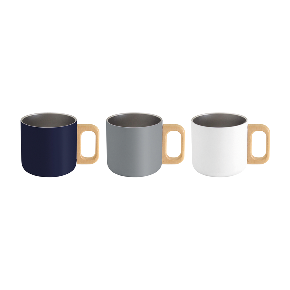 Taza de cerámica con cuchara de acero inoxidable y base de madera larga.