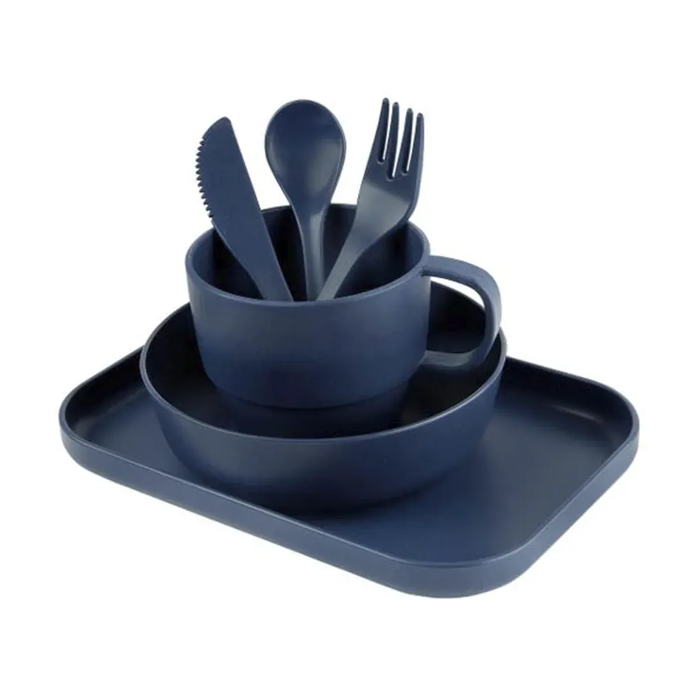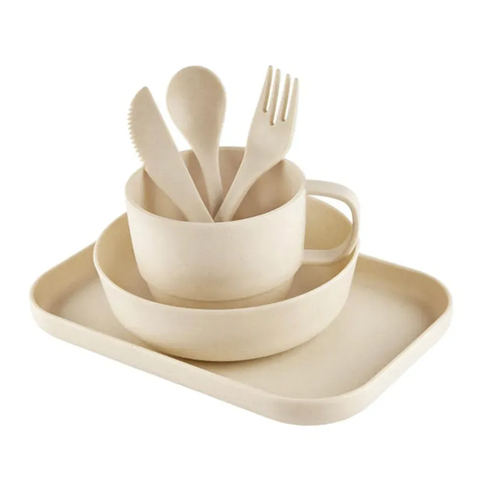 Vajilla de 6 piezas con material eco-friendly. Contiene plato extendido, plato hondo, taza, cuchara, tenedor y cuchillo. Con un diseño atractivo y funcional, es ideal tanto para los más pequeños como para los adultos, garantizando una experiencia de comida segura y respetuosa con el medio ambiente. Incluye caja individual.