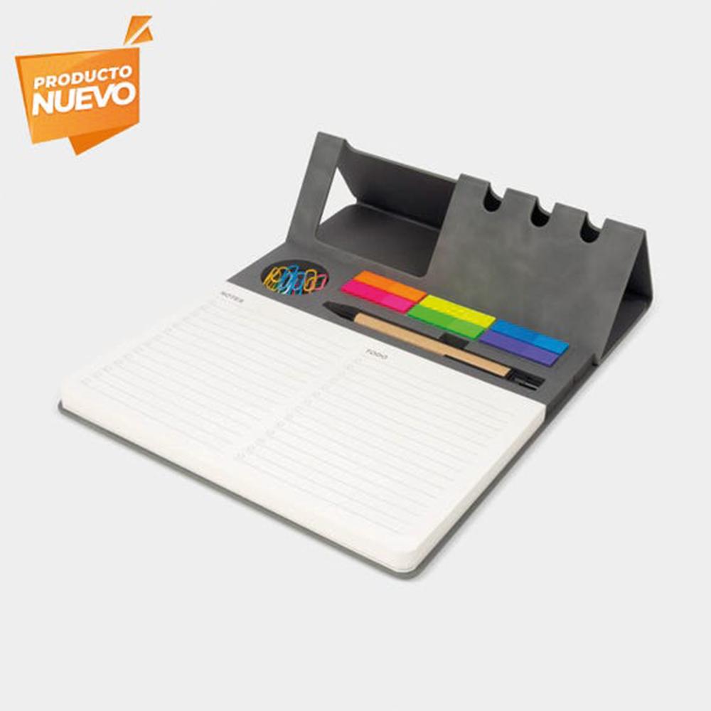 Carpeta de poliuretano con broche magnético y placa metálica, con porta papeles en la pasta, en el interior cuenta con porta tarjetas, 98 hojas rayadas y arillo metálico.