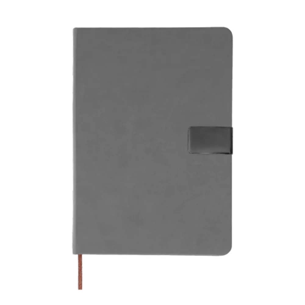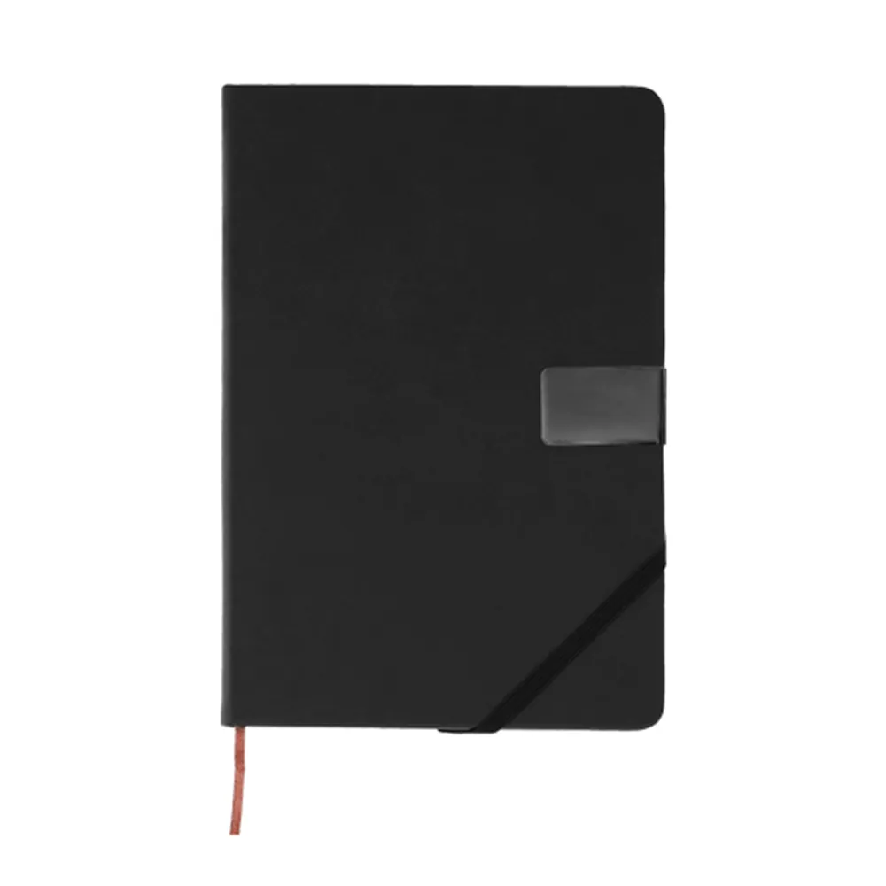 Libreta de poliuretano con 96 hojas rayadas, banda elástica en la parte inferior, separador y placa metálica.