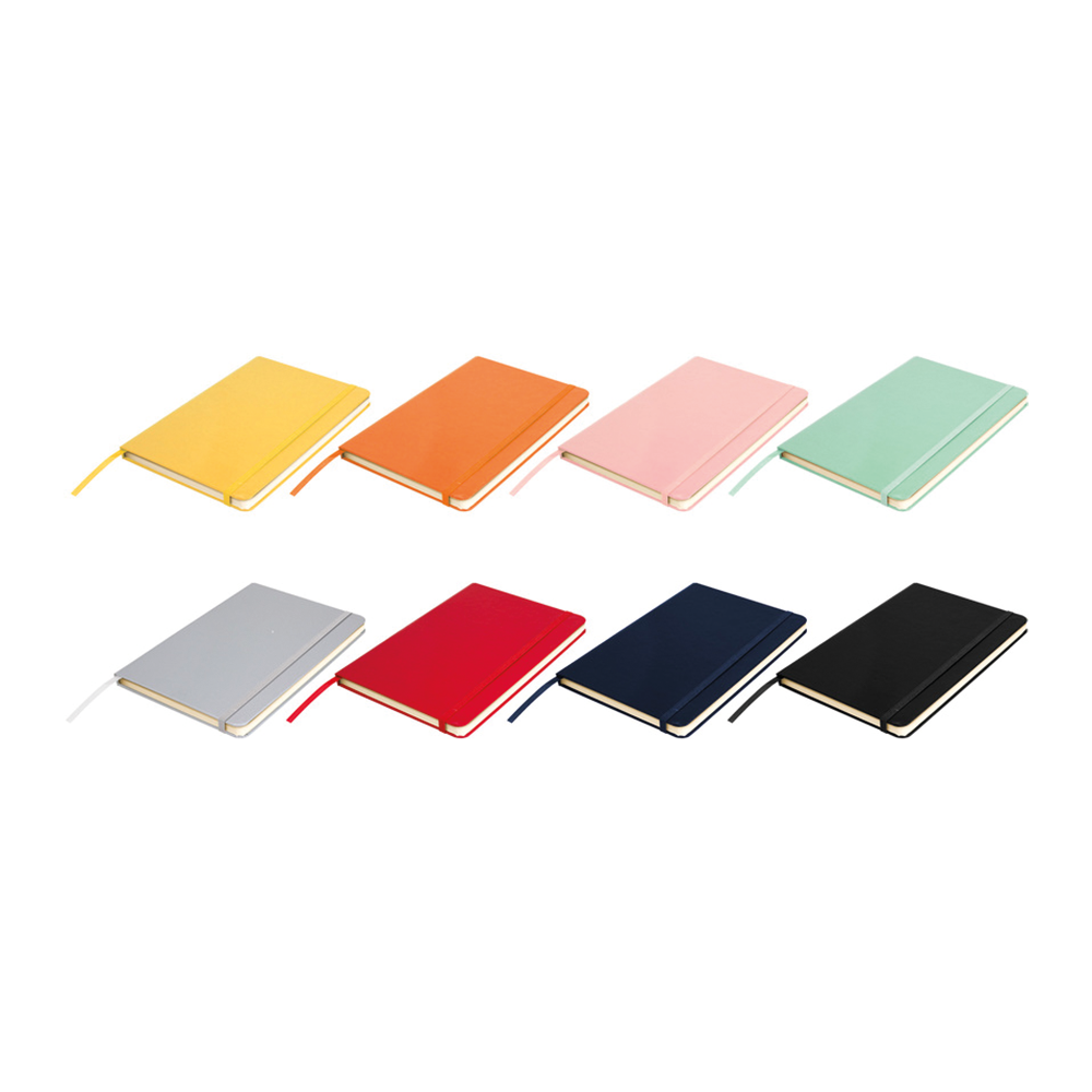 Libreta de poliuretano con 90 hojas rayadas y tonos pastel.