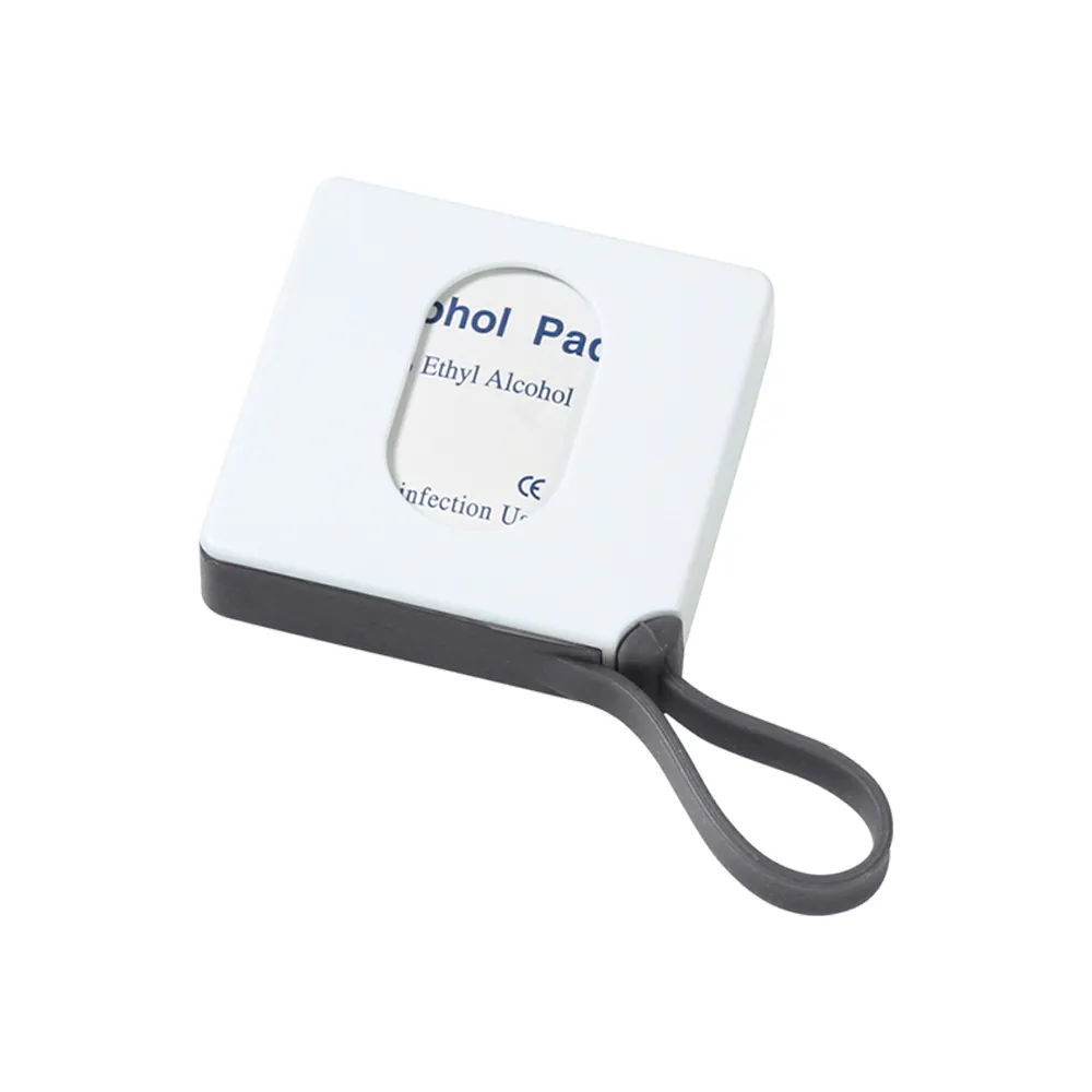 Contenedor fabricado en plástico ABS, correa de silicón y detalle tipo ventana abierta en una de sus caras, con 10 pads de non woven con alcohol al 70%.