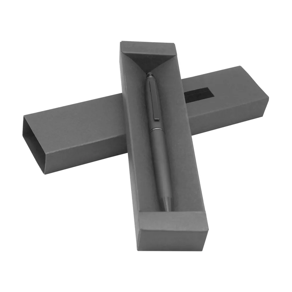 Bolígrafo metálico con tapón. Cuerpo en color gris y el tapón en color gun. Incluye estuche.