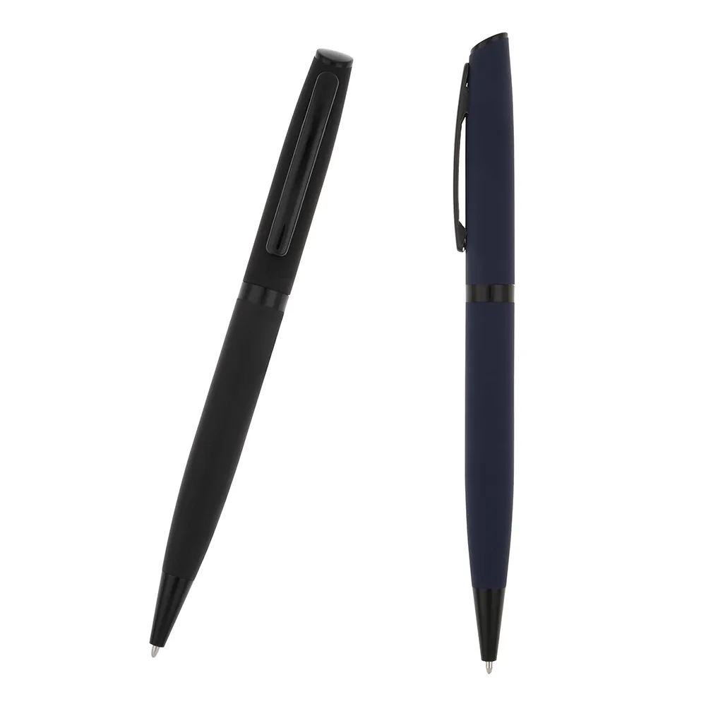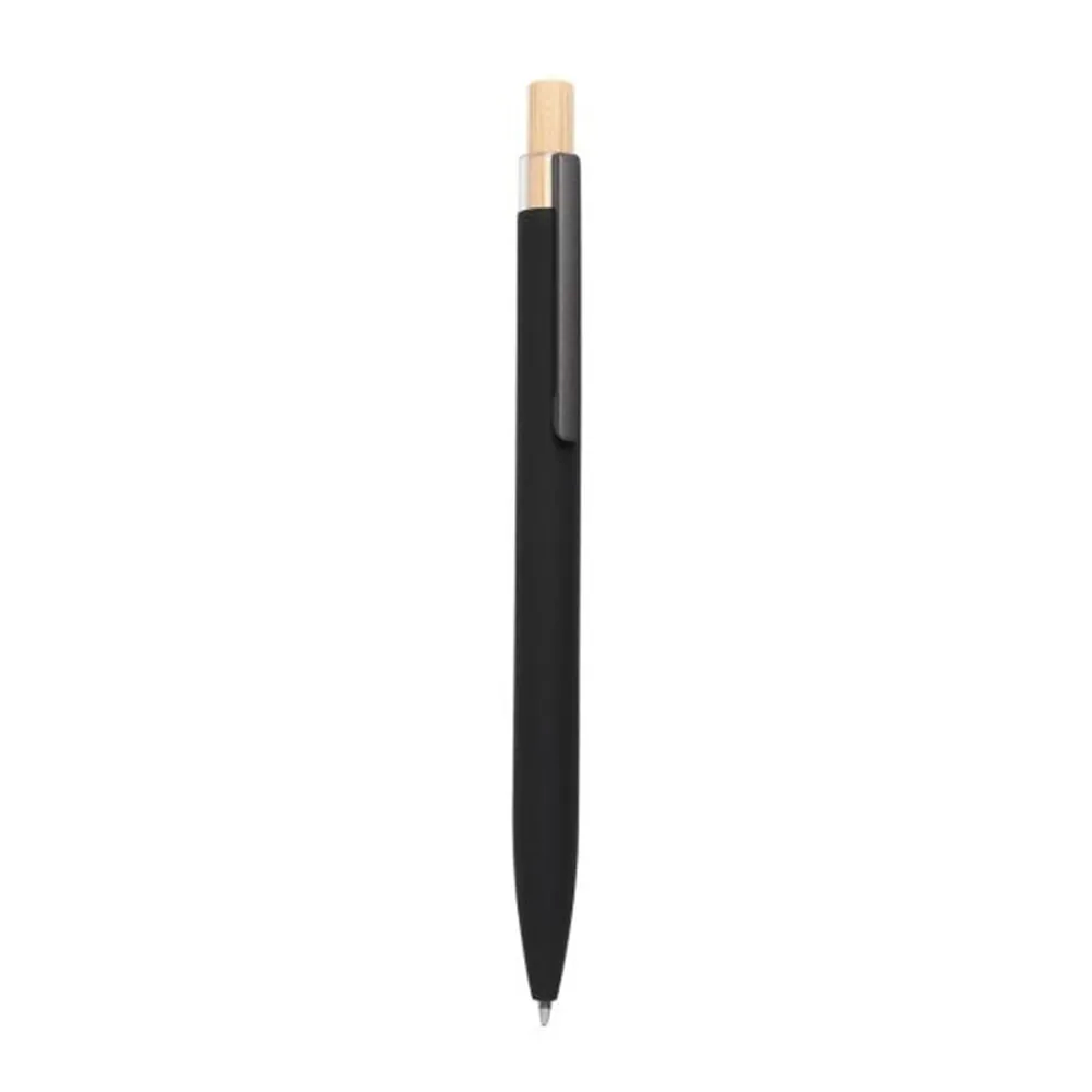 Bolígrafo con terminado tipo rubber. Mecanismo pulsador y botón de madera.