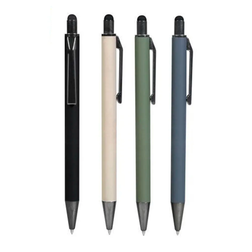 Bolígrafo con terminado tipo rubber y touch screen. Mecanismo pulsador. Clip y punta en color metalizado oscuro.