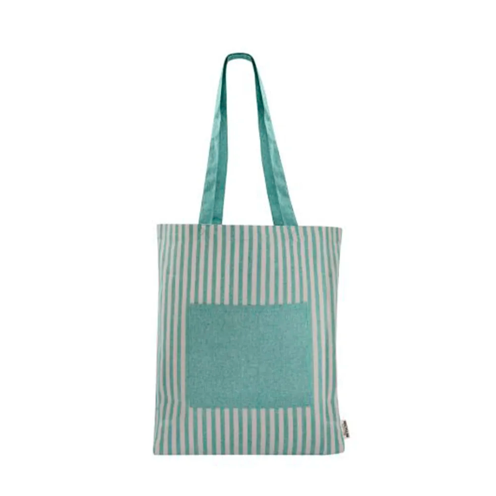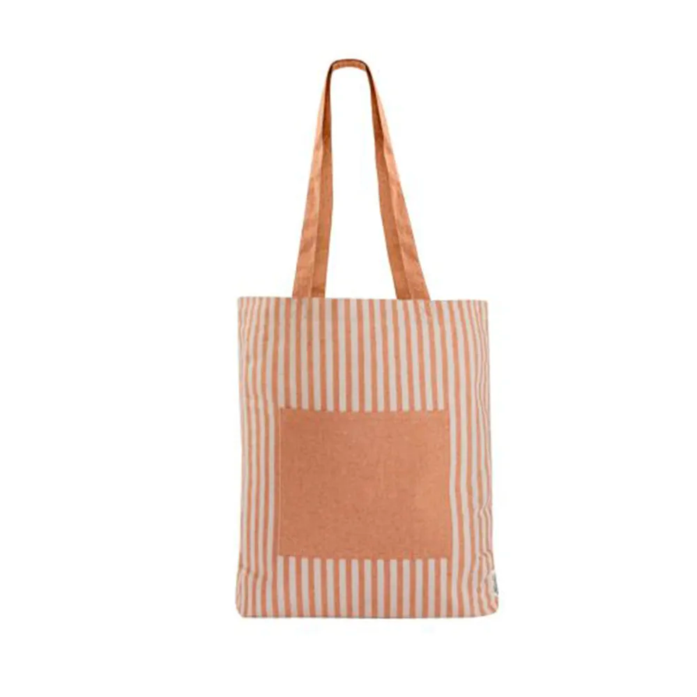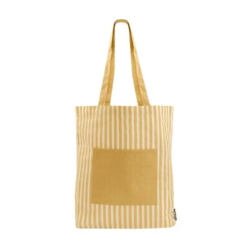 Bolsa ecológica de algodón reciclado. Sin fuelle. Incluye bolsillo frontal. Estampado de rayas.