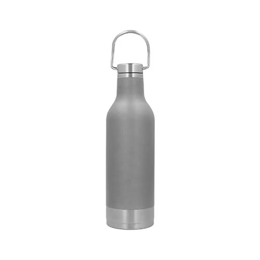 Termo con doble pared de acero inoxidable, tapa con asa metálica enroscable y base de metal.