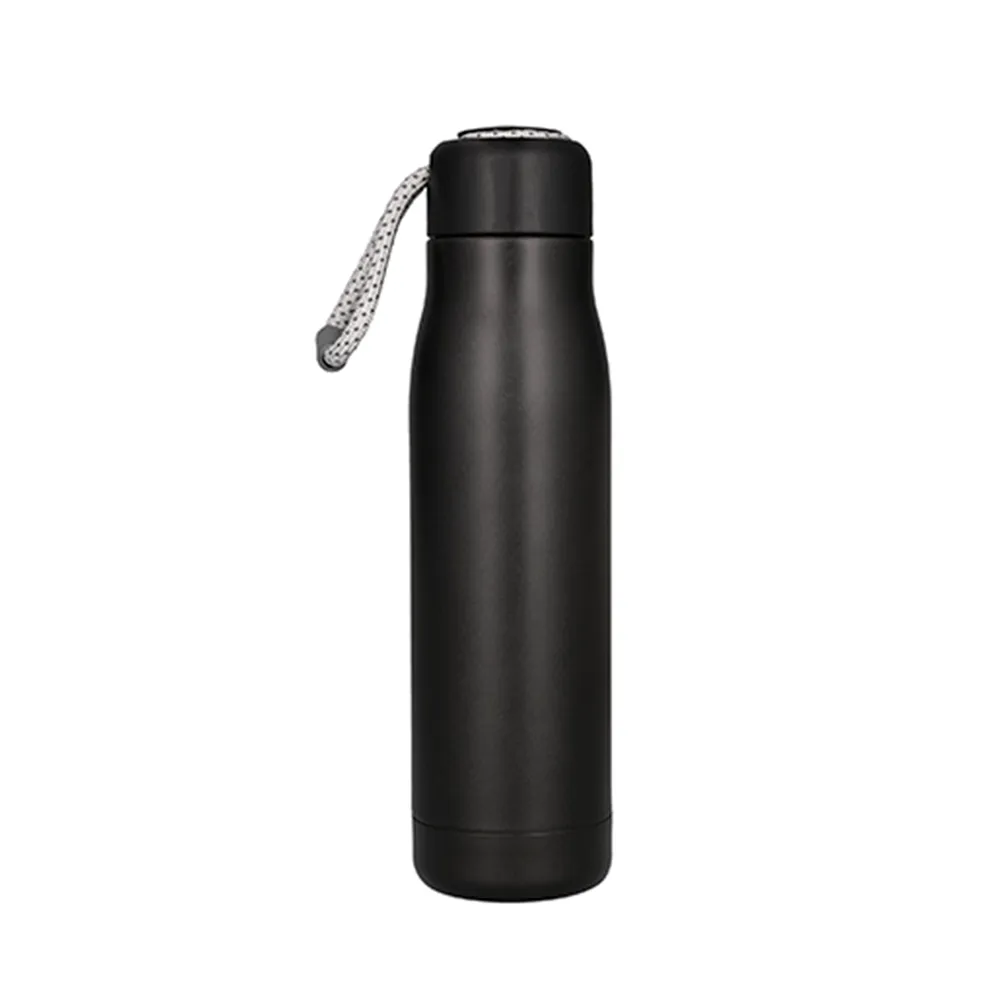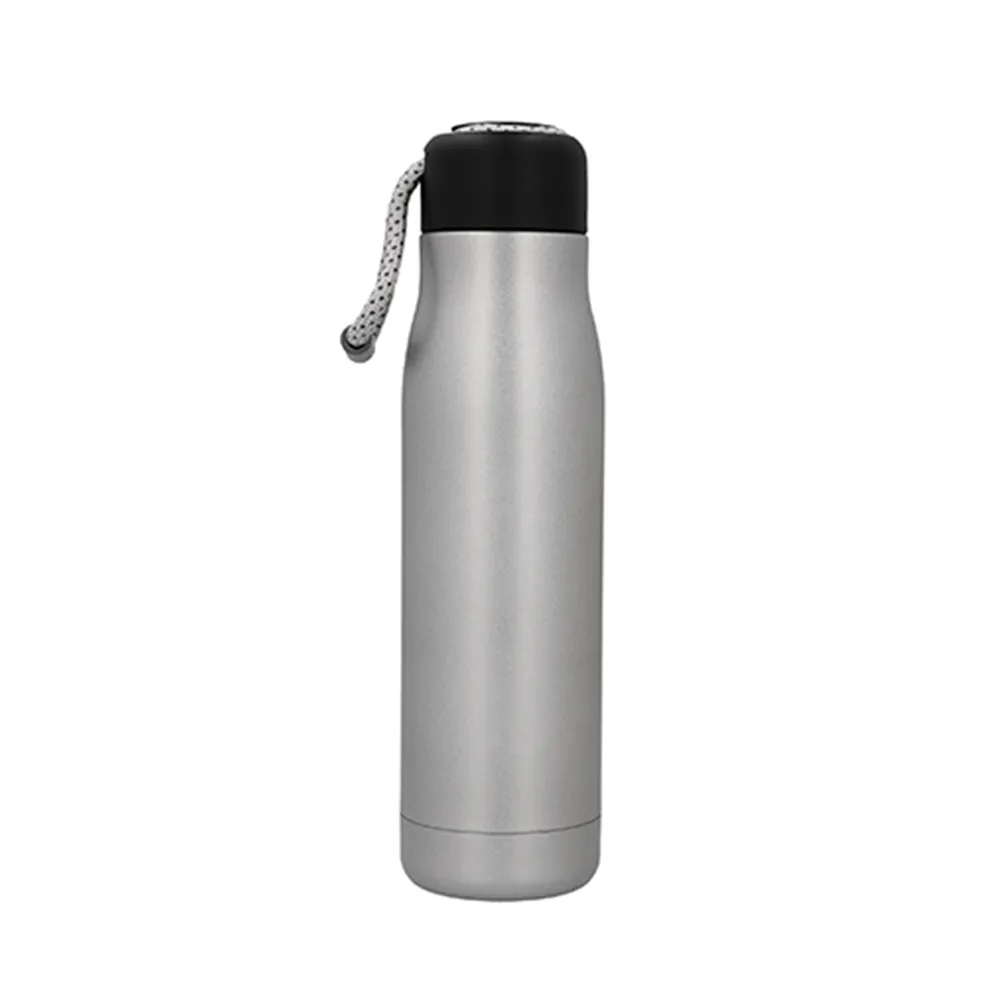Termo con doble pared de acero inoxidable, con tapa enroscable plástica y correa de poliéster.