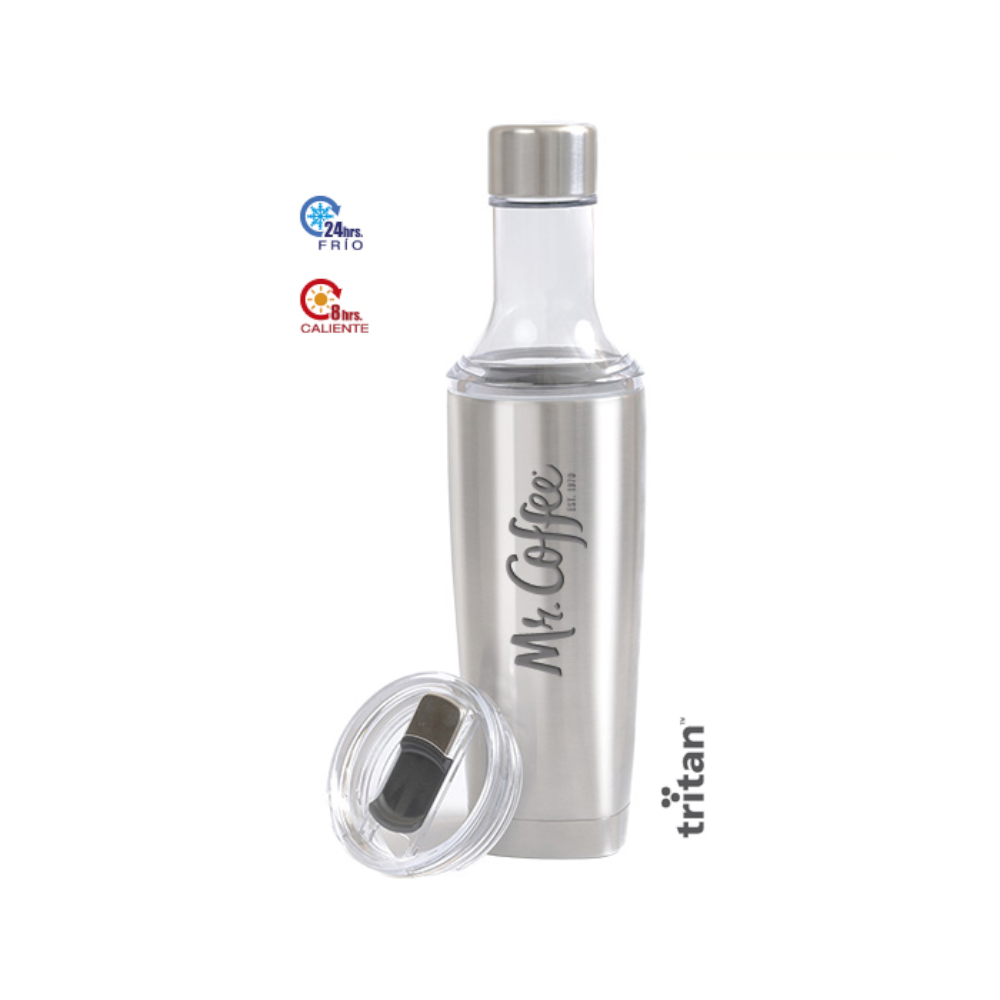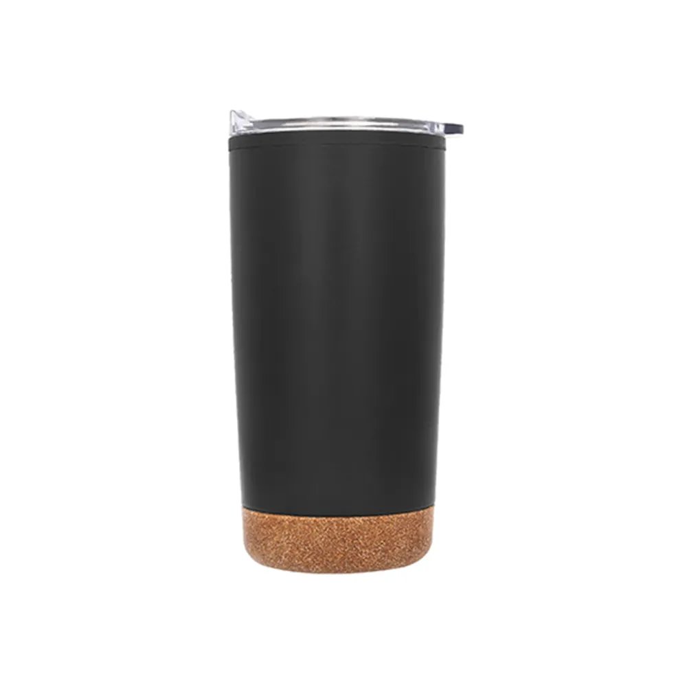 Termo con doble pared de acero inoxidable e interior de plástico, base de corcho, tapa traslúcida a presión con seguro deslizable y boquilla.