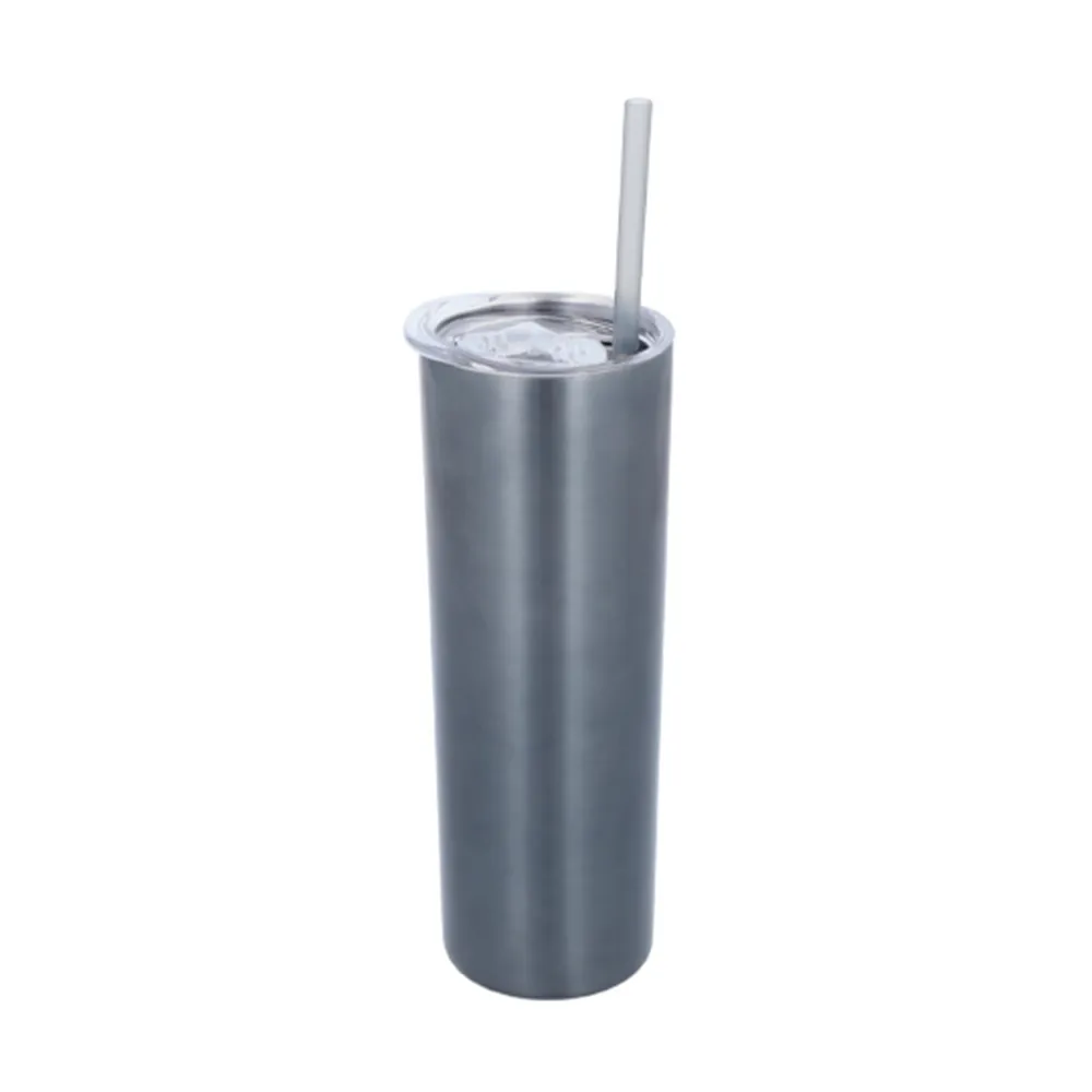 Termo de acero inoxidable de doble pared insulado al vacío con tapa de plástico a presión con boquilla deslizable y popote de plástico.