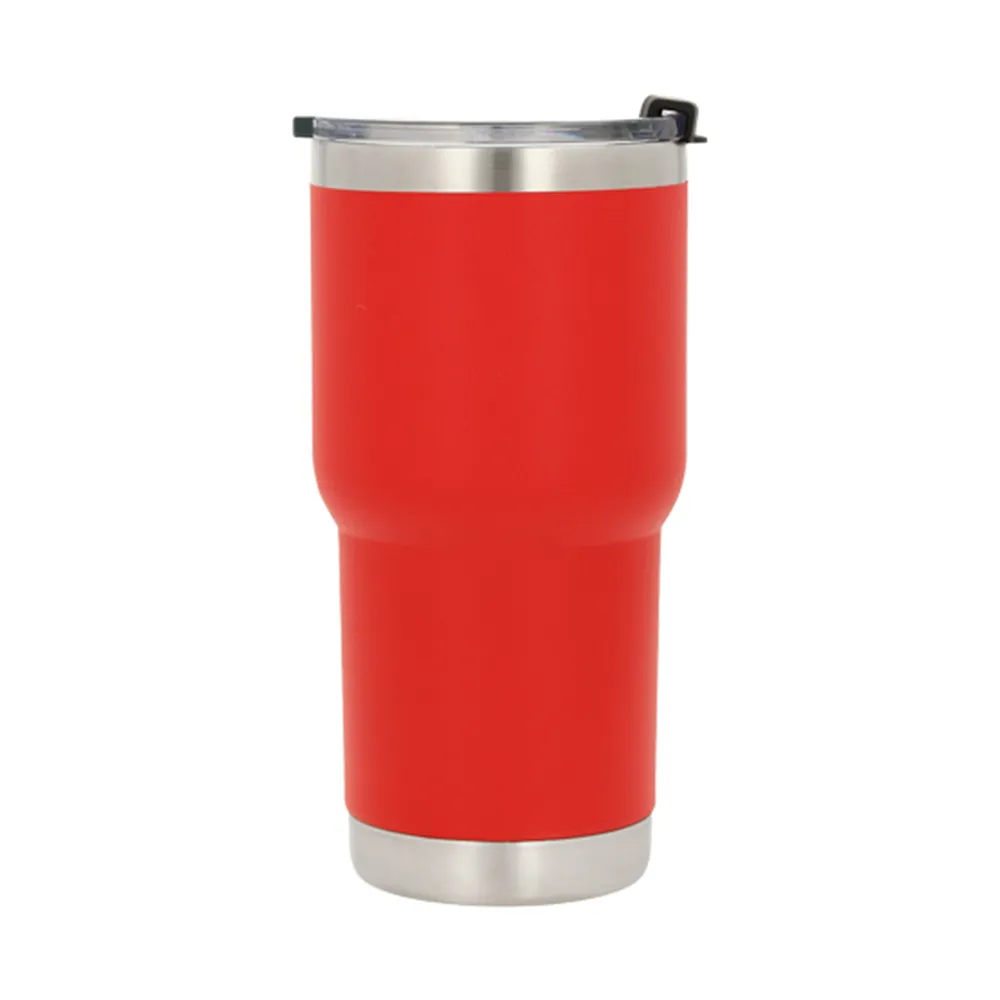 Termo con doble pared de acero inoxidable insulado al vacío con acabado rugoso. Incluye tapa transparente de cierre a presión.