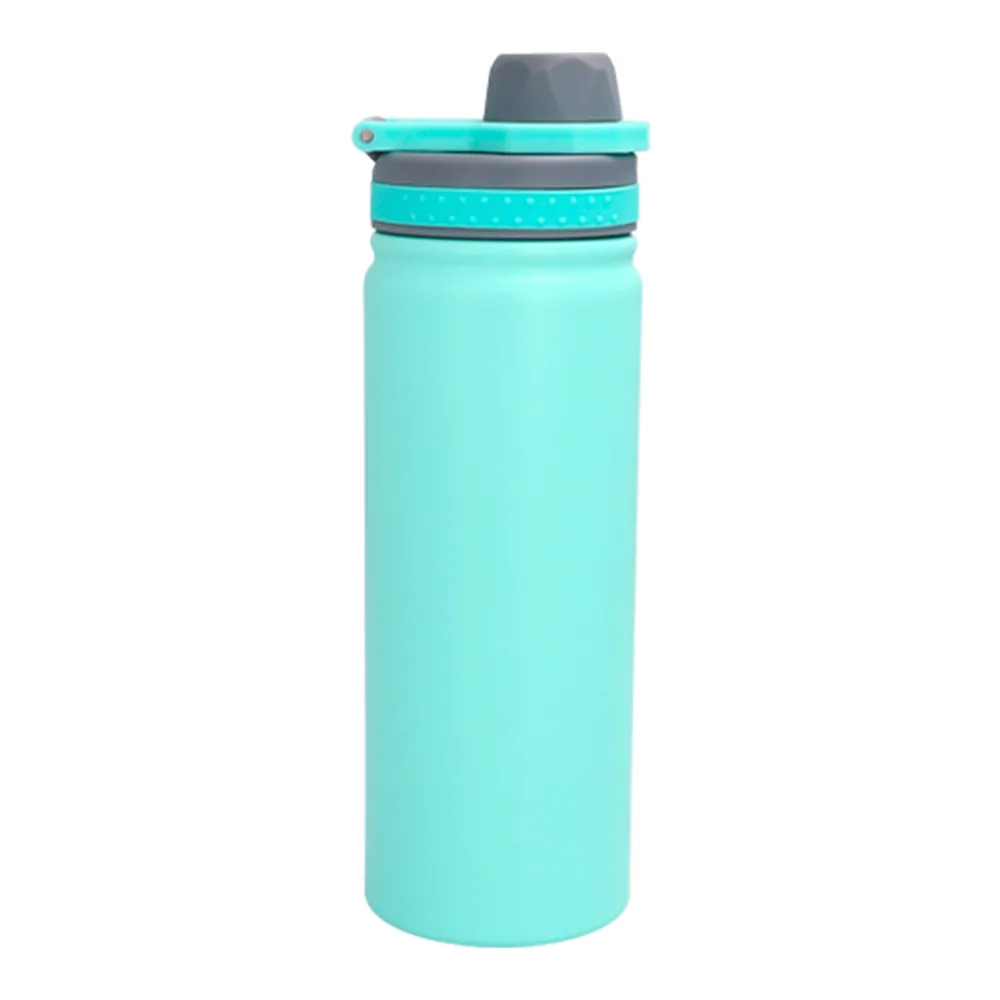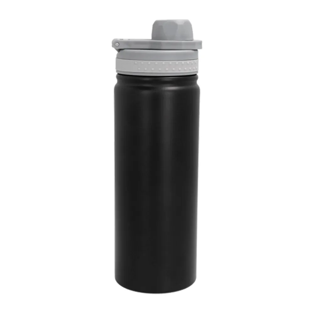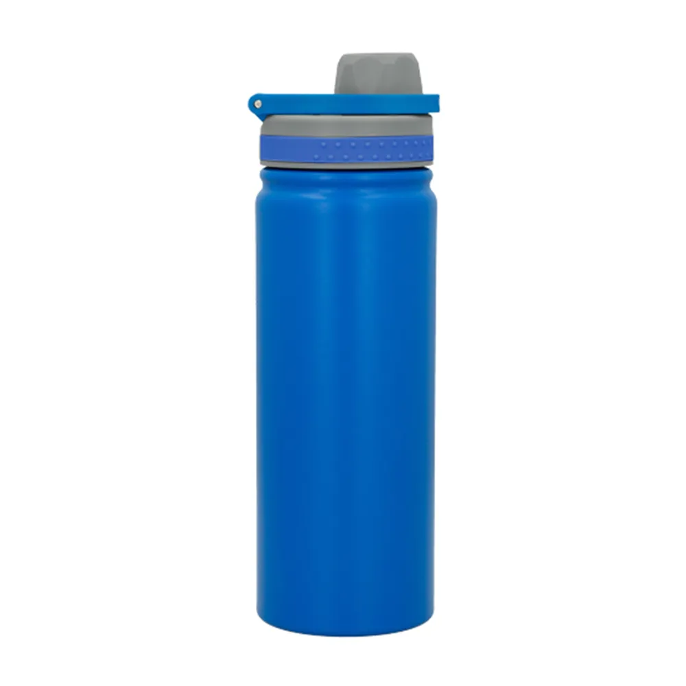 Termo de acero inoxidable de doble pared insulado al vacío con acabado rugoso. Cuenta con una tapa de rosca con asa para sujetarlo fácilmente.