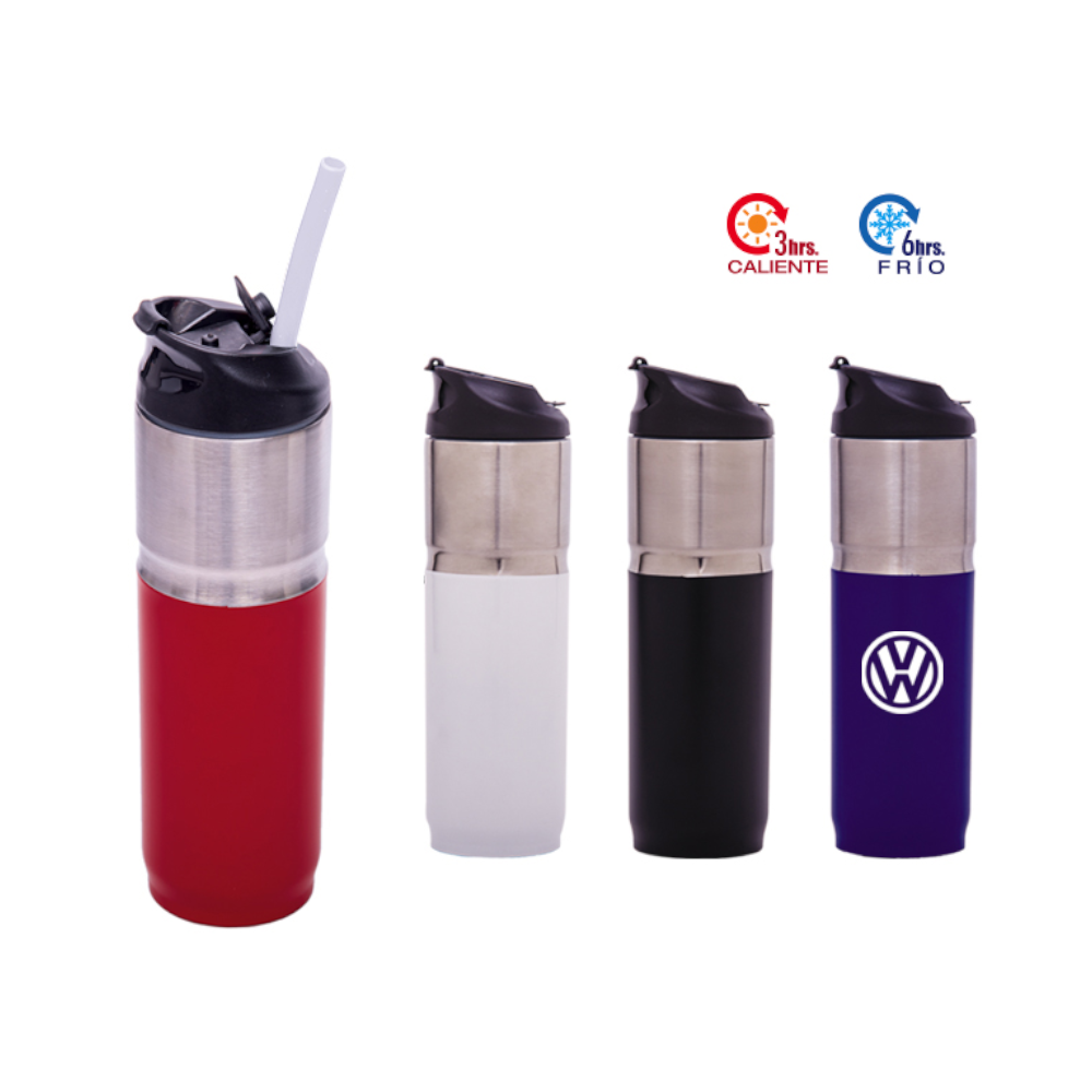 Termo de acero inoxidable y doble pared insulado al vacío con tapa de seguridad la cual puede ser utilizada como taza.