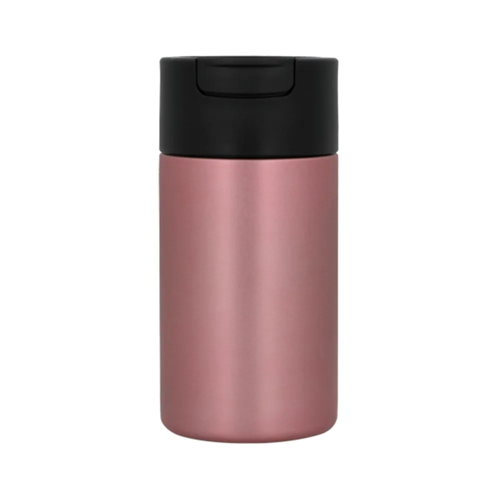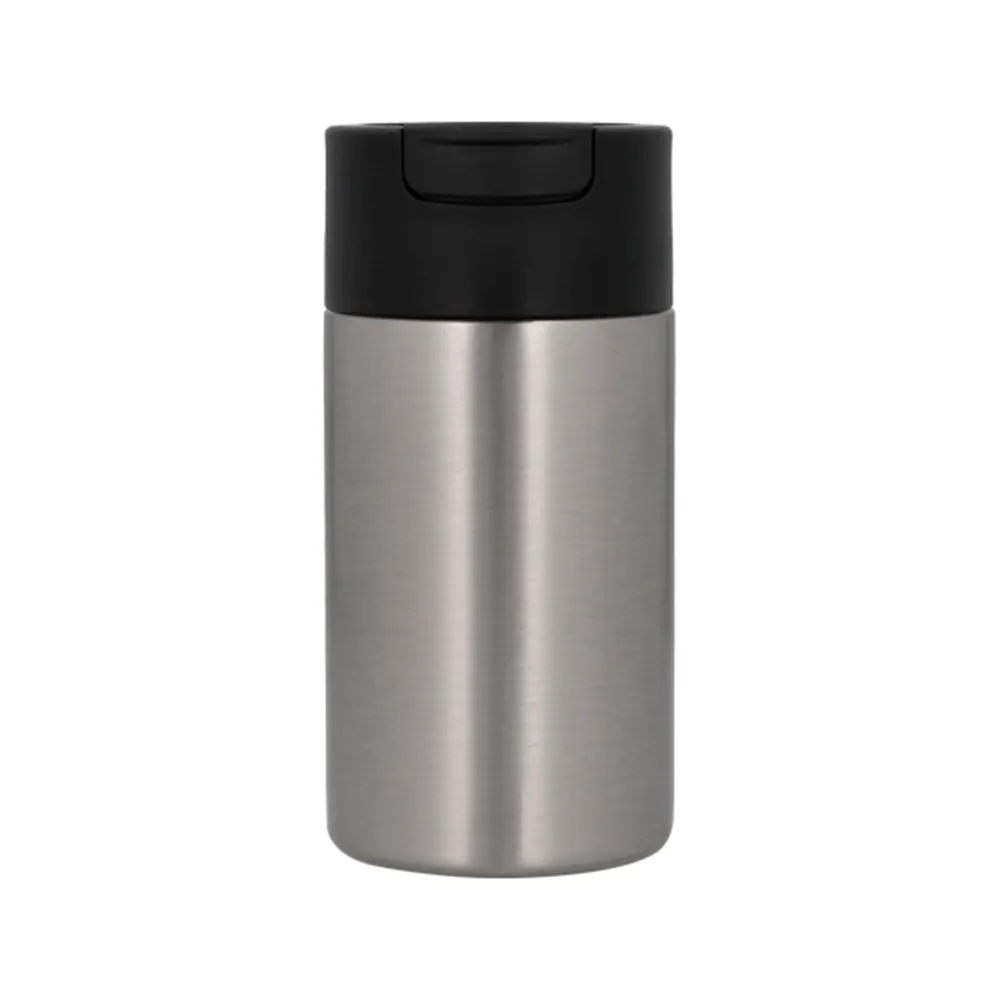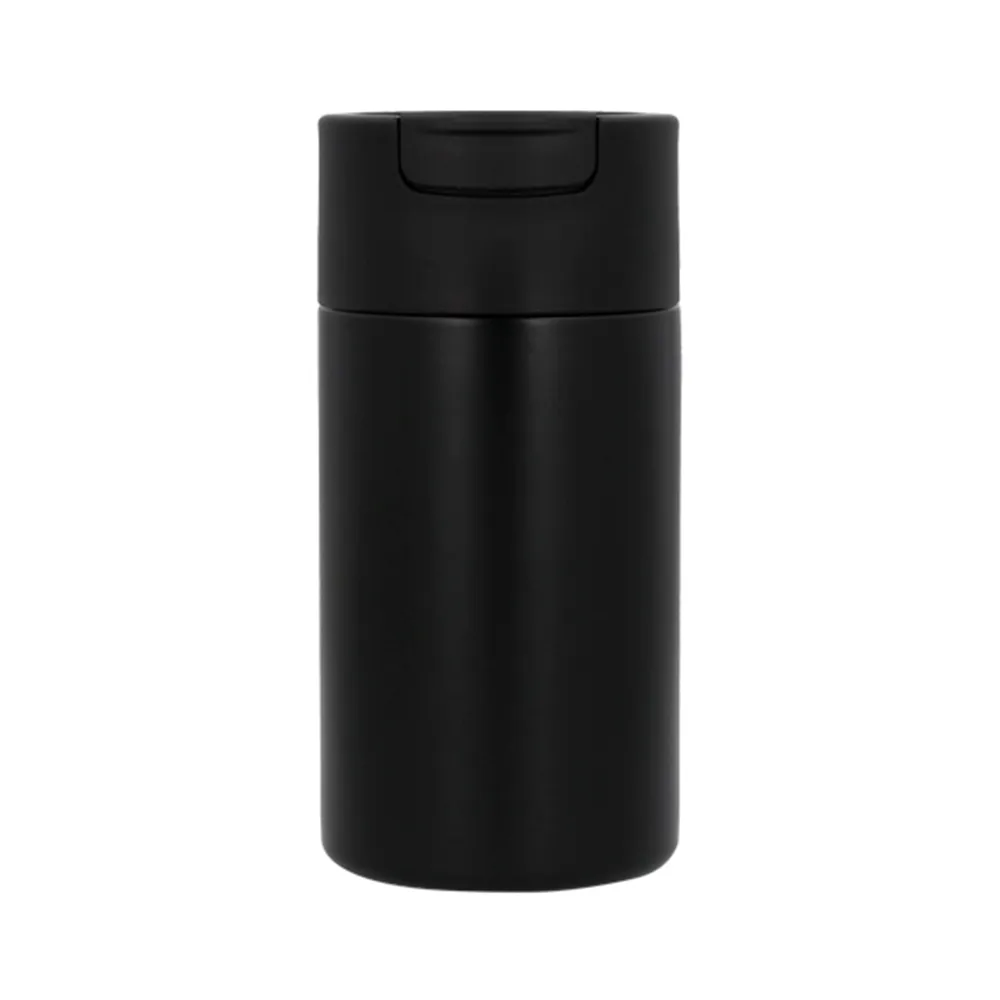 Termo de acero inoxidable y doble pared insulado al vacío con tapa enroscable con boquilla de seguridad.